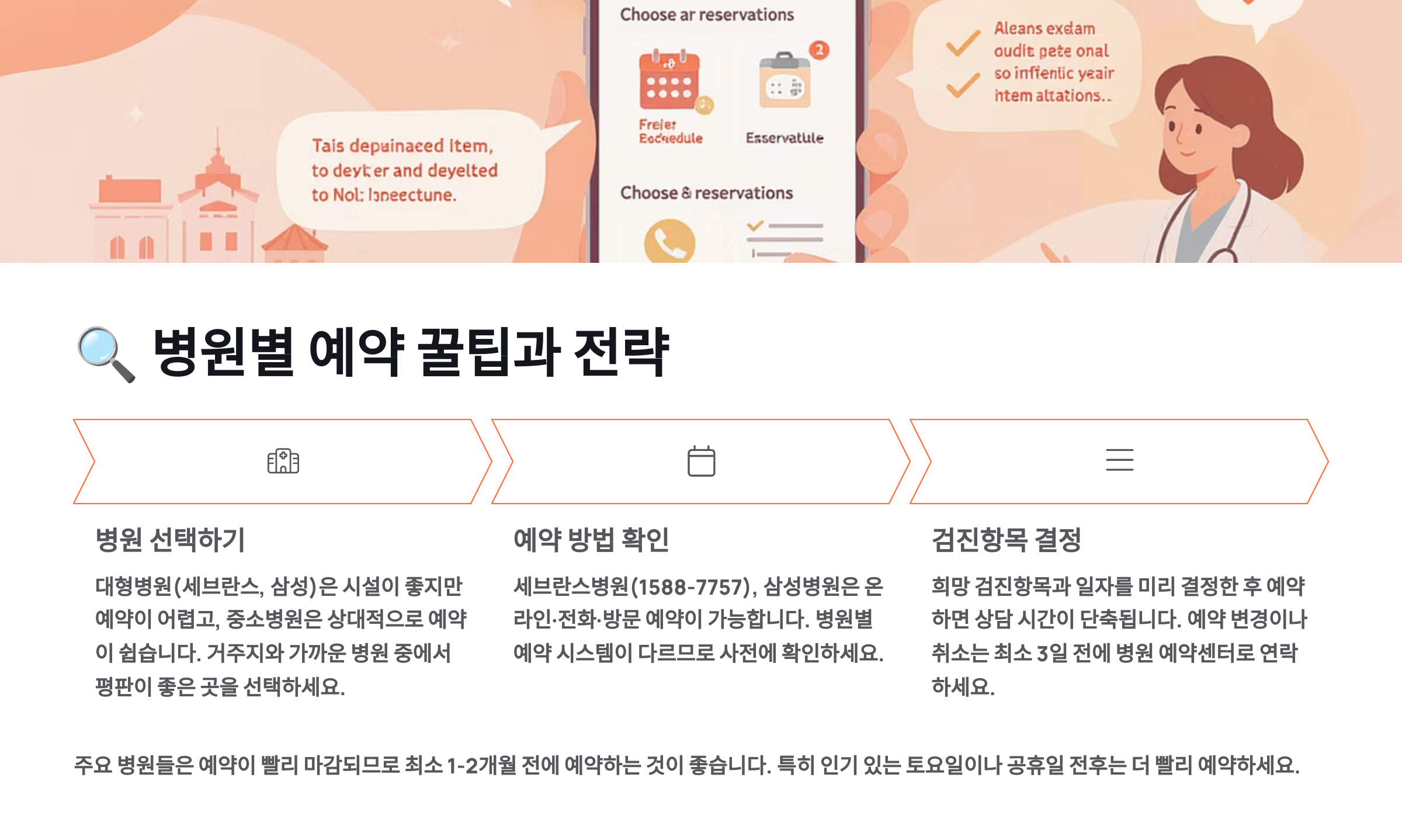 | 대학병원 | 2-3개월 전 예약, 평일 선택 | 정밀검진 필요한 경우 |