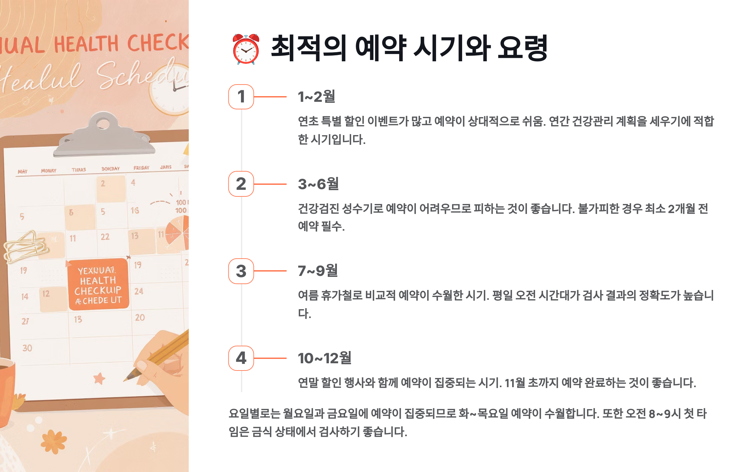 건강검진 예약 시기를 잘 선택하면 더 편안하고 효율적인 검진을 받을 수 있어요. 계절별, 월별, 심지어 요일별로도 예약 난이도와 대기 시간이 달라진답니다. 일반적으로 연말(11-12월)은 검진 대상자들이 몰려서 예약이 어렵고 대기 시간도 길어요. 반면 연초(1-3월)는 상대적으로 여유로운 편이죠. 나의 라이프스타일과 일정을 고려해서 최적의 시기를 선택하는 게 중요해요! 📅
