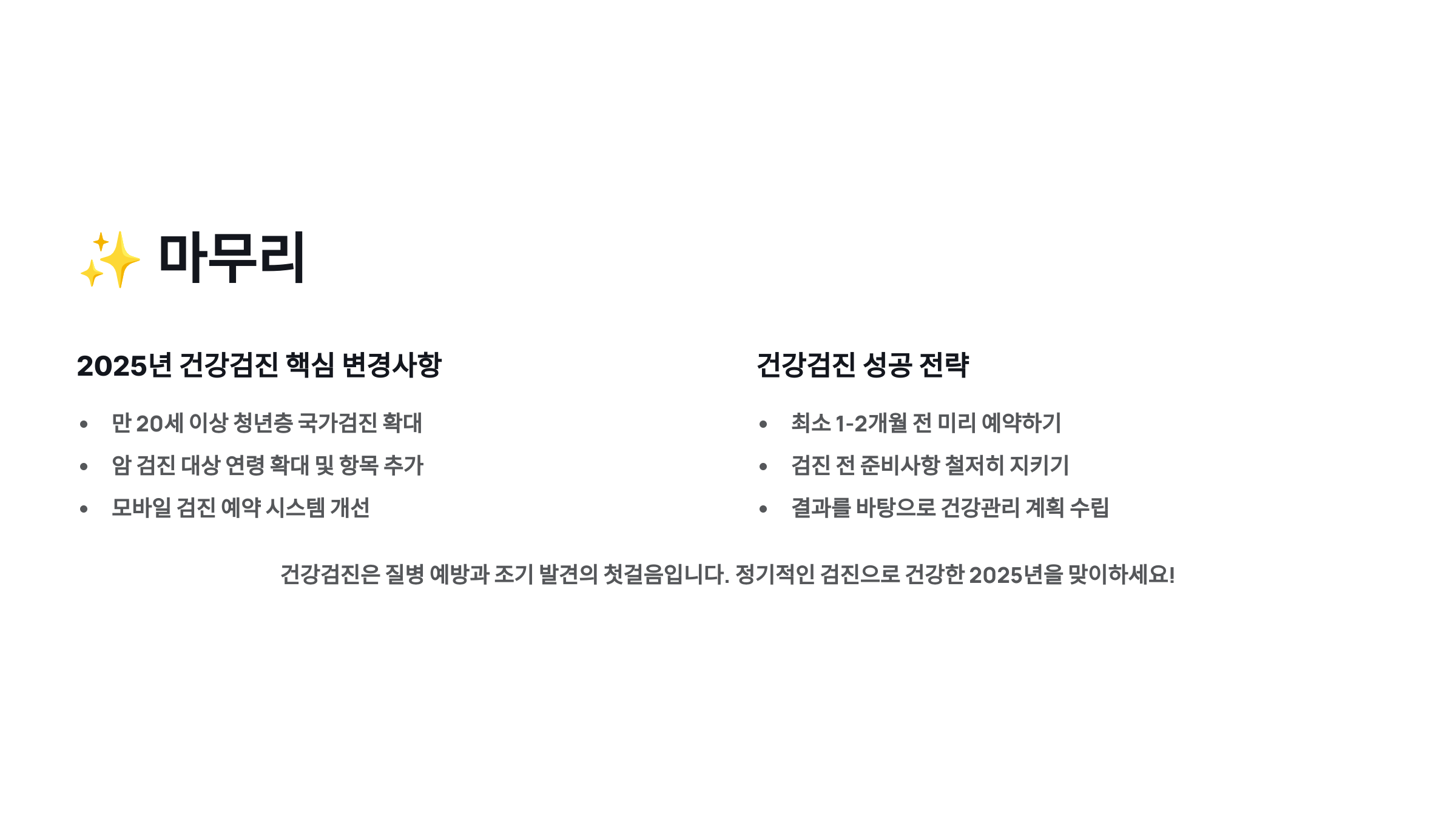 건강은 잃고 나서 그 소중함을 깨닫게 되는 경우가 많아요. 하지만 정기적인 건강검진을 통해 미리 예방하고 관리한다면, 더 건강하고 행복한 삶을 살 수 있답니다. 특히 2025년 현재는 디지털 헬스케어 기술이 발달해서 예약부터 결과 관리까지 더욱 편리해졌어요. 이런 좋은 시스템을 적극 활용해서 나와 가족의 건강을 지켜나가시길 바라요. 건강한 미래를 위한 첫걸음, 오늘 바로 건강검진 예약부터 시작해보는 건 어떨까요? 💪