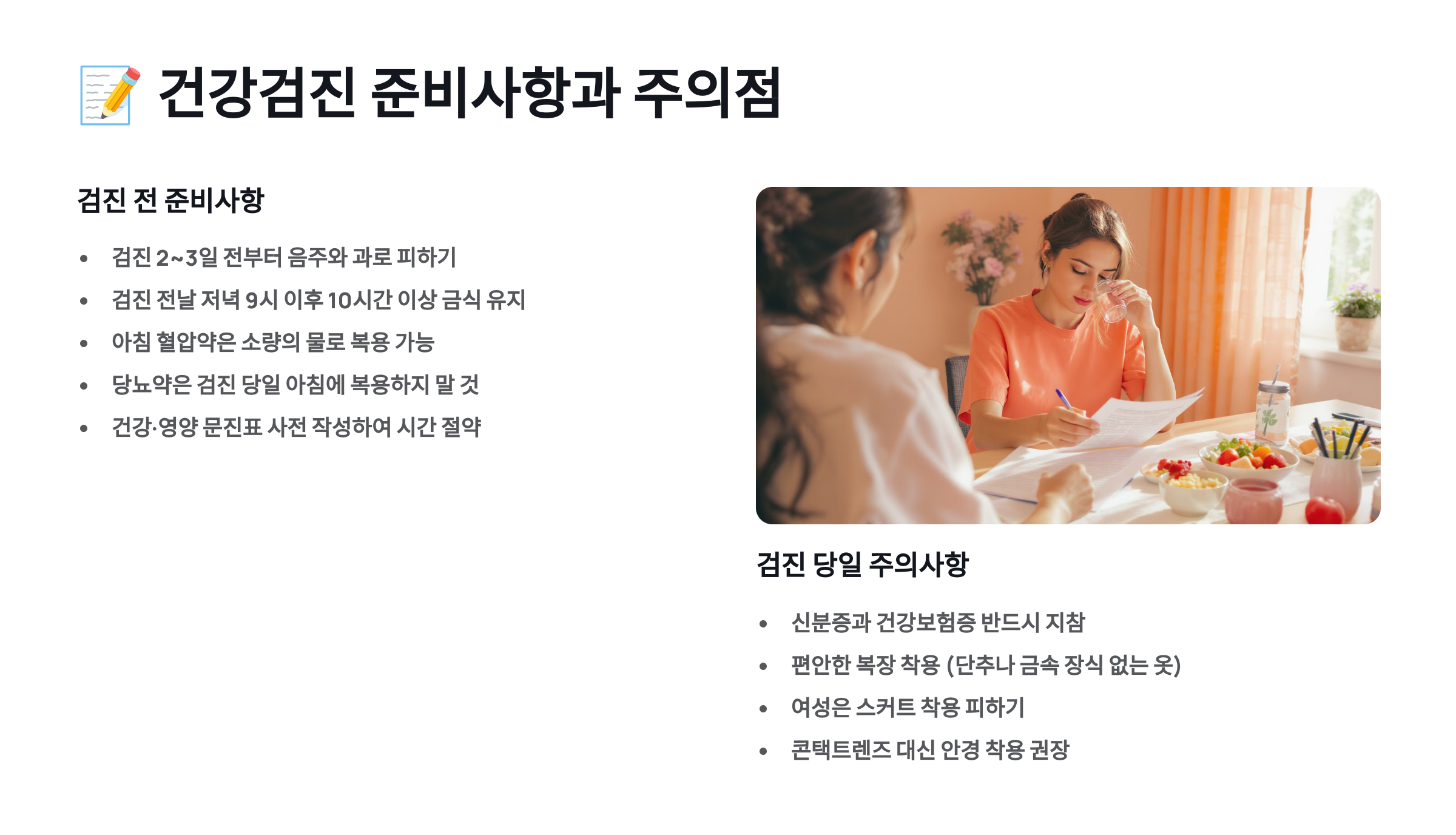 건강검진을 제대로 받으려면 사전 준비가 정말 중요해요. 검진 전날부터 지켜야 할 사항들이 있는데, 이를 제대로 지키지 않으면 정확한 검사 결과를 얻기 어려워요. 기본적으로 검진 전날 저녁 9시 이후부터는 금식해야 하고, 물도 자정 이후에는 마시면 안 돼요. 흡연과 음주도 최소 3일 전부터는 피하는 게 좋답니다. 🚭