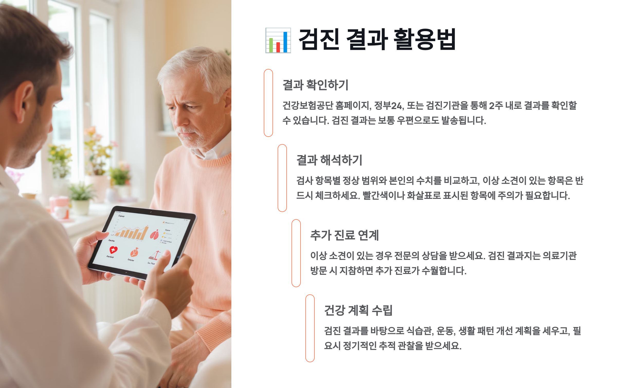 | 결과 확인 | 종합판정, 이상 수치 확인 | 정상 범위 숙지 |