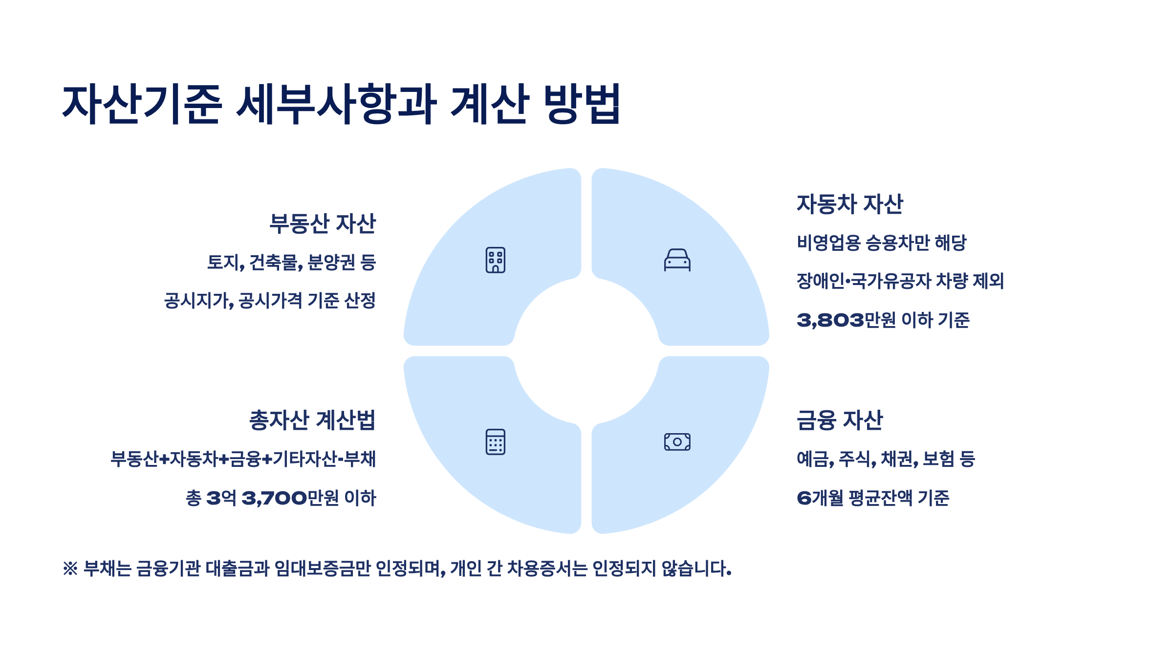 자산기준은 부동산 가격 상승을 반영해 일부 상향되었지만, 여전히 엄격한 편이에요. 총자산 기준은 유형별로 2억 3,700만원에서 3억 4,500만원 사이로 설정되어 있고, 자동차 가격 기준도 3,557만원에서 3,803만원으로 제한되어 있어요.