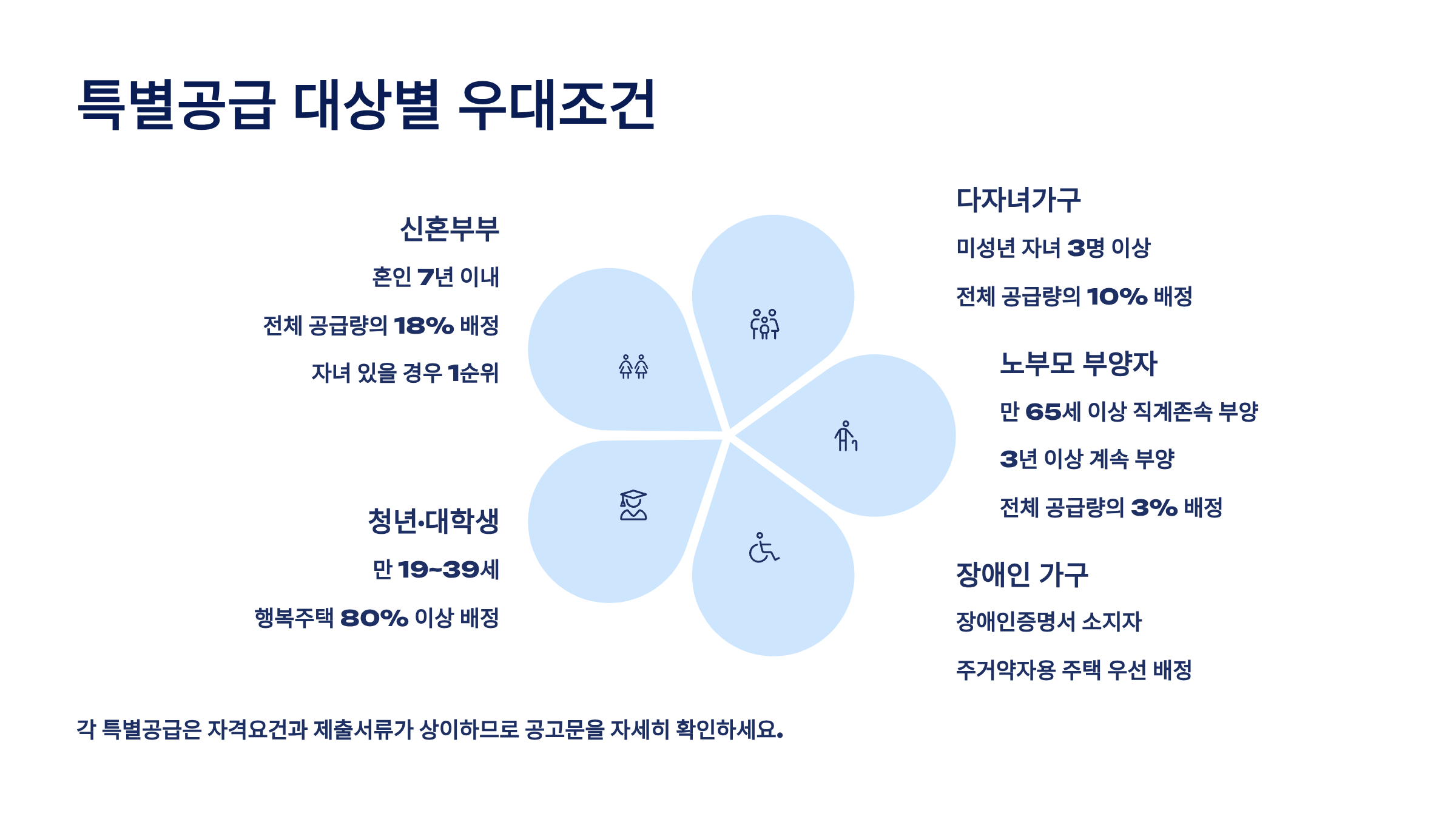 각 유형별로 특별공급과 우선공급 제도가 있어요. 신혼부부, 다자녀가구, 노부모부양가구, 장애인, 국가유공자 등은 일반공급보다 유리한 조건으로 신청할 수 있죠. 특히 신혼부부의 경우 전체 공급량의 30~40%를 별도로 배정받기 때문에 당첨 확률이 높아요.