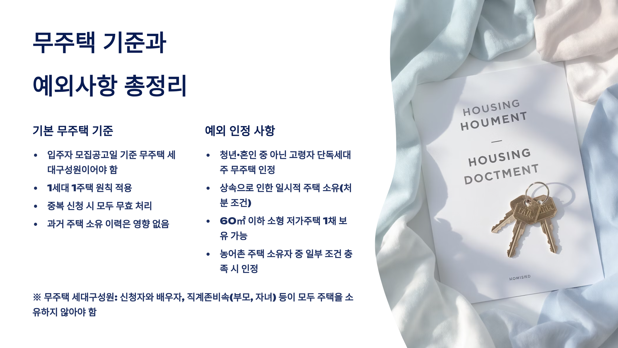 하지만 모든 주택 소유가 문제되는 것은 아니에요. 여러 예외 조항이 있죠. 만 60세 이상 직계존속이 소유한 주택은 예외로 인정받을 수 있어요. 단, 해당 주택에 본인이 거주하고 있으면 안 돼요. 또한 상속으로 취득한 주택을 처분 중이거나, 소형·저가주택을 1호만 소유한 경우도 예외가 될 수 있어요.