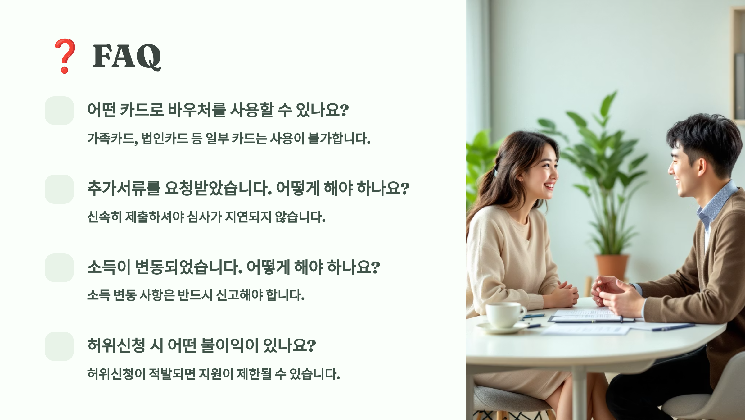 세 번째 질문은 "중간에 소득이 늘어나면 어떻게 되나요?"예요. 만약 직장을 옮기거나 사업이 잘되어서 소득이 기준을 초과하게 되면 급여 지급이 중단될 수 있어요. 하지만 이런 변동사항은 본인이 신고해야 하는 의무가 있어요. 그리고 정기조사에서 발견되면 소급해서 급여를 반환해야 할 수도 있으니까 정직하게 신고하는 것이 좋아요. 반대로 소득이 줄어들었다면 즉시 재신청해서 다시 혜택을 받을 수 있답니다.