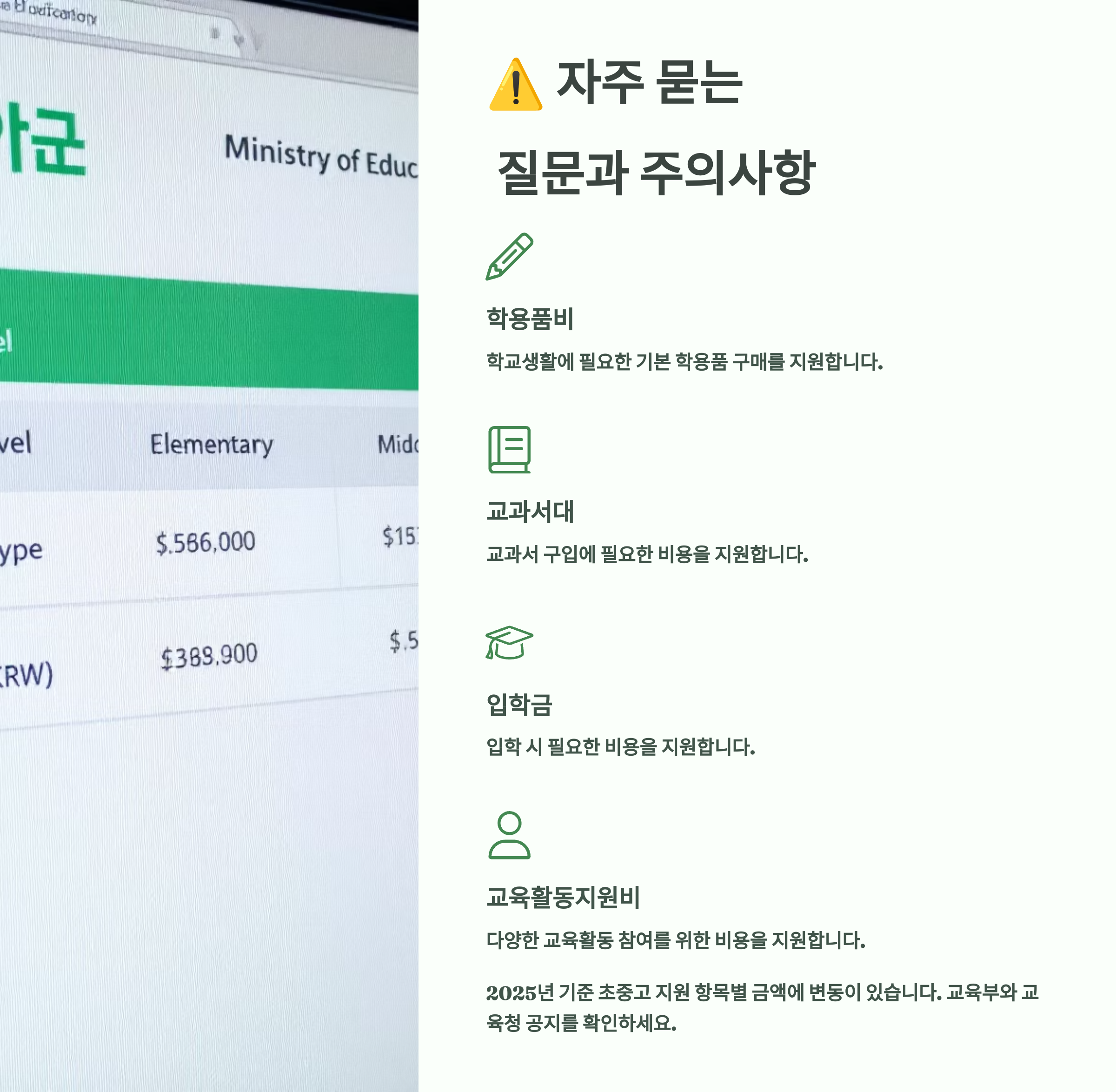 마지막으로 많이 받는 질문은 "교육급여로 받은 돈을 꼭 교육비로만 써야 하나요?"인데요. 법적으로는 교육 목적으로 사용하는 것이 원칙이지만, 실제로는 사용처를 일일이 확인하지는 않아요. 다만 교육급여의 취지를 생각해서 학생의 교육에 도움이 되는 용도로 사용하는 것이 바람직해요. 예를 들어 학용품, 참고서, 학원비, 교통비 등에 사용하면 되는 거죠. 교육과 전혀 관련 없는 용도로 사용하는 것은 제도의 취지에 맞지 않으니까 주의해야 해요.