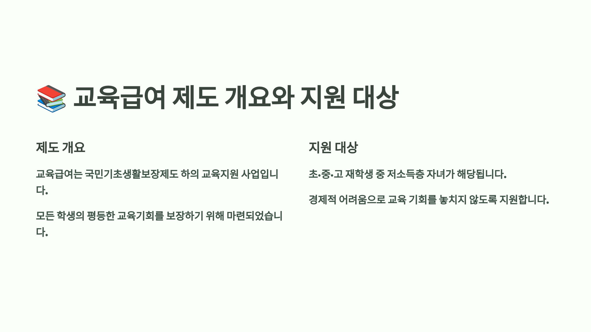 교육급여 제도는 단순히 돈을 지원하는 것이 아니라 교육 형평성을 실현하는 중요한 정책이에요. 가정의 경제적 상황 때문에 아이들이 교육받을 기회를 잃는 일이 없도록 하는 것이 이 제도의 근본 취지랍니다! 💡