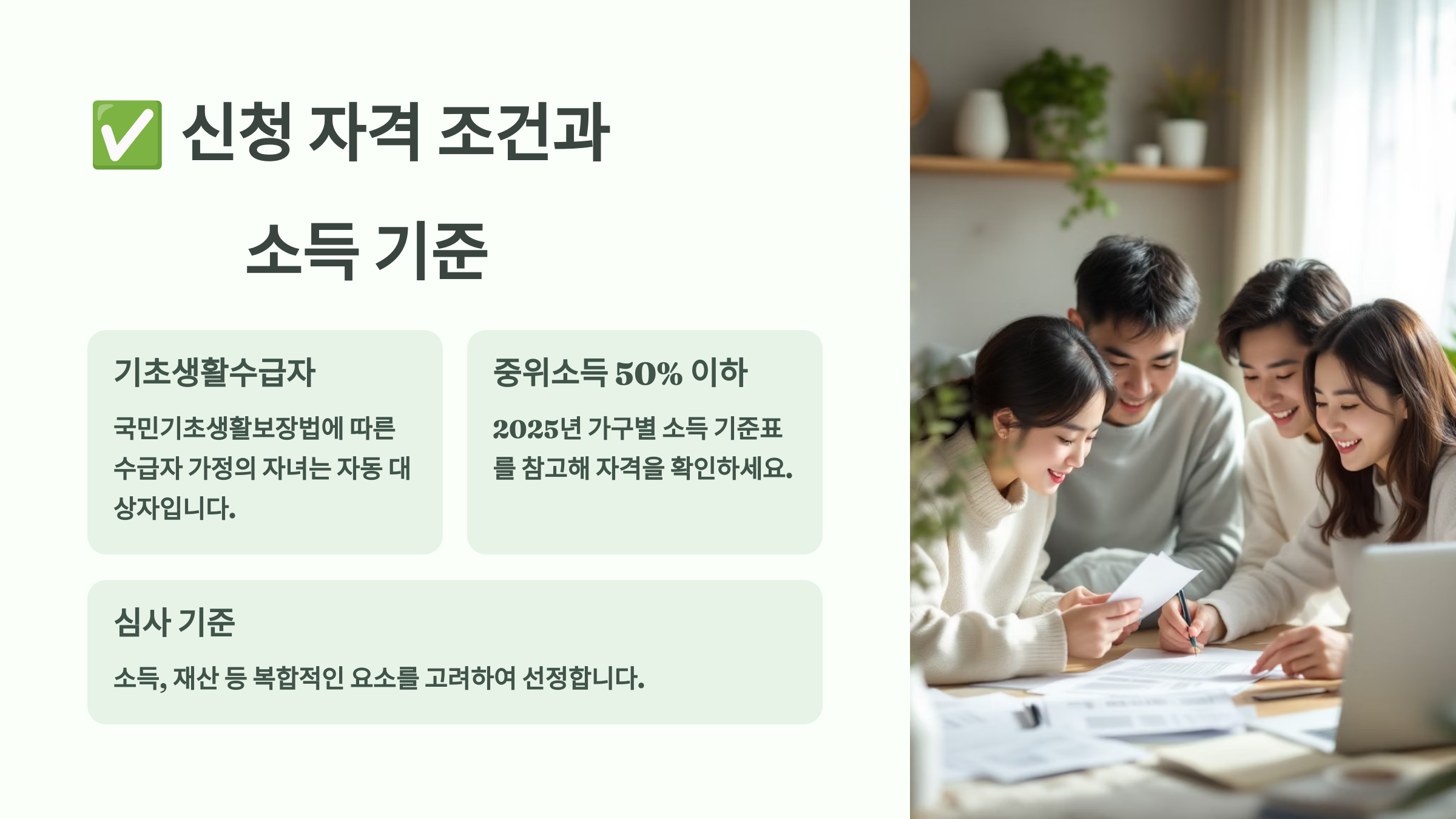 교육급여 신청 자격의 핵심은 소득인정액이 기준 중위소득 50% 이하여야 한다는 점이에요. 2025년 기준으로 4인 가구의 경우 월 소득인정액이 약 275만 원 이하면 교육급여를 받을 수 있답니다. 여기서 말하는 소득인정액은 실제 소득뿐만 아니라 재산의 소득환산액까지 포함한 개념이에요. 단순히 월급만 보는 것이 아니라 가족이 소유한 부동산, 자동차, 예금 등도 함께 계산해서 판단하는 거죠.