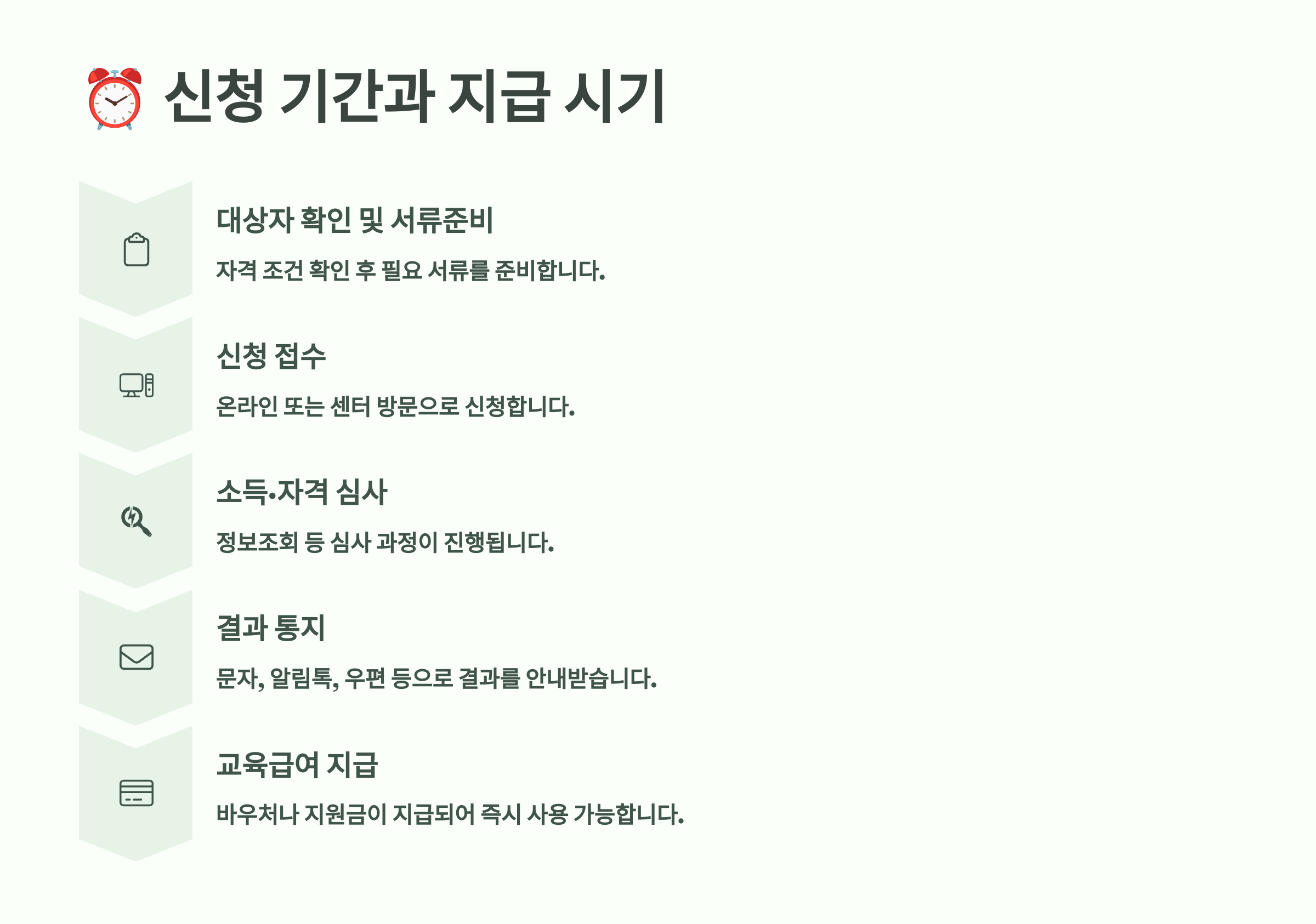교육급여는 연중 언제든지 신청할 수 있어요. 다른 일부 장학금이나 지원 제도처럼 특정 기간에만 신청받는 것이 아니라서, 가정 상황이 변화했을 때 즉시 신청할 수 있다는 장점이 있어요. 하지만 신청 시기에 따라 지급받는 금액이 달라질 수 있어서 시기를 잘 맞춰서 신청하는 것이 중요해요. 예를 들어, 3월에 신청해서 승인받으면 3월부터 12월까지의 급여를 받을 수 있지만, 9월에 신청하면 9월부터 12월까지만 받을 수 있거든요.