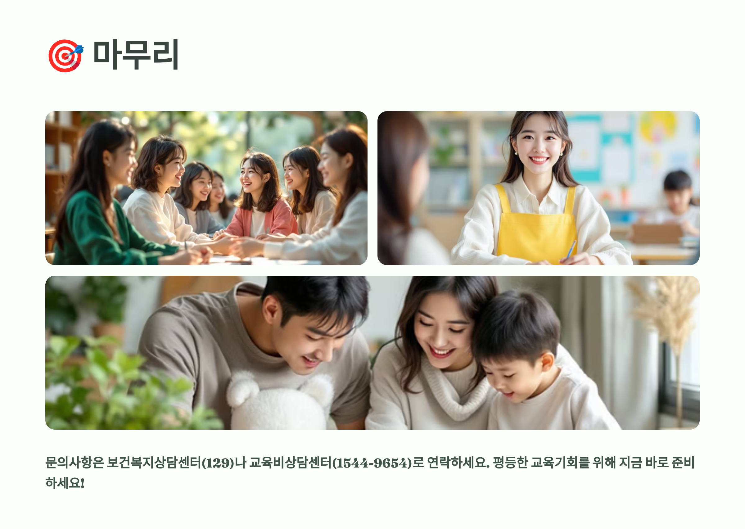 교육급여는 단순한 돈의 지원이 아니라 모든 아이들이 공평한 교육 기회를 가질 수 있도록 하는 사회의 약속이에요. 우리 사회가 추구하는 교육 평등의 가치를 실현하는 중요한 정책이니까, 자격 요건에 해당하는 가정이라면 주저하지 말고 신청하세요. 여러분의 아이가 더 나은 교육 환경에서 꿈을 키워갈 수 있도록 국가가 함께 돕겠다는 의미니까요. 지금 바로 자격 조건을 확인해보시고, 해당된다면 내일이라도 신청해보세요! 🌟