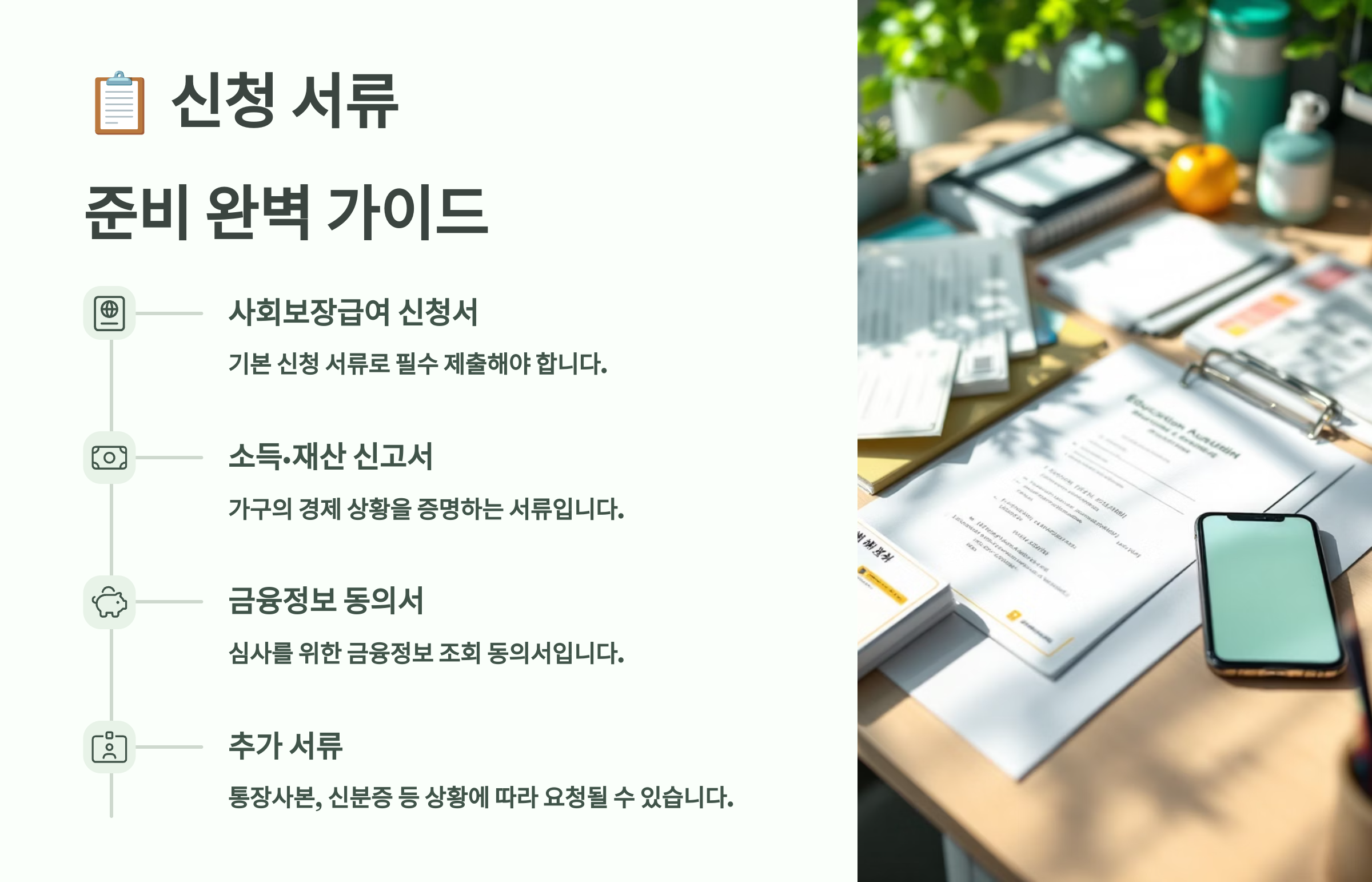 들이고, 추가 서류는 개별 가구의 상황에 따라 제출하는 것들이랍니다. 가장 중요한 기본 서류는 사회보장급여 제공 신청서인데, 이는 온라인이나 오프라인에서 작성할 수 있어요. 신청서에는 가구원 정보, 소득 및 재산 현황, 특이사항 등을 자세히 기재해야 해요.
