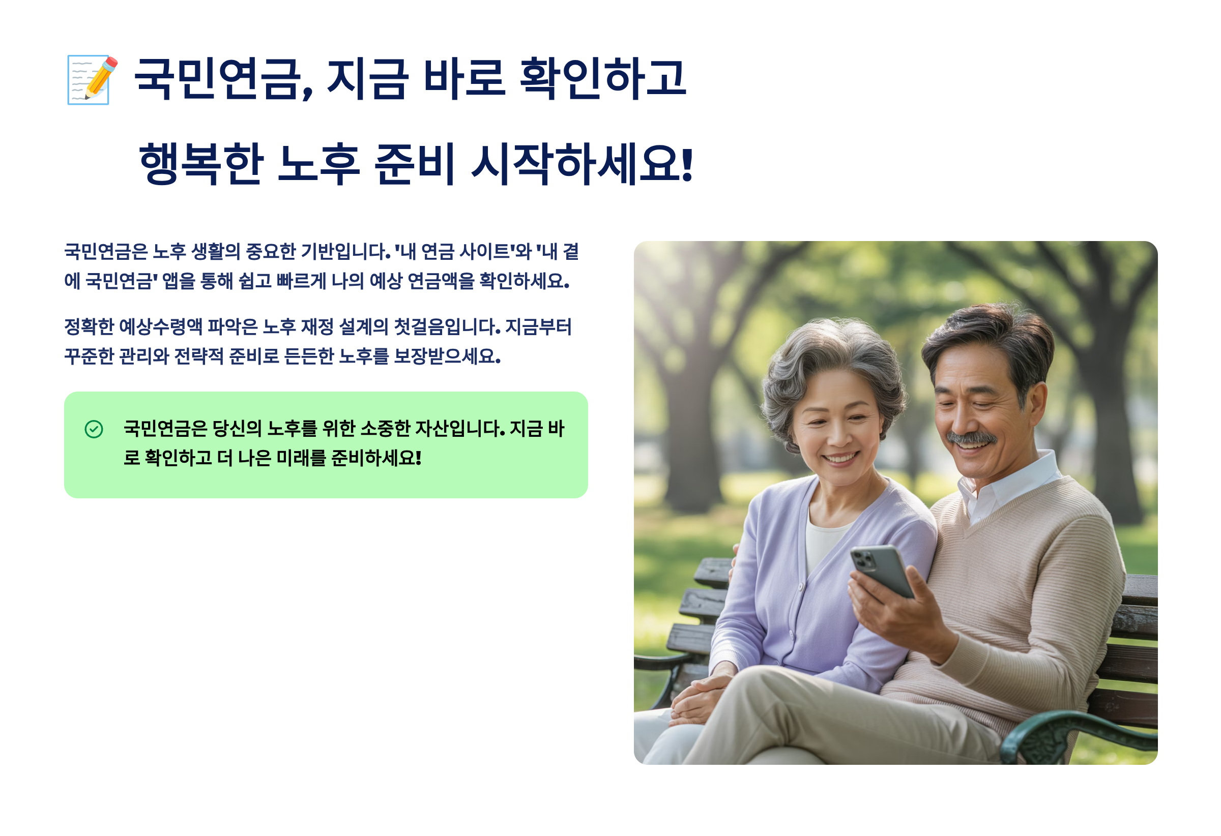 본 글에서 제공하는 국민연금 관련 정보는 2025년 1월 기준이며, 일반적인 안내를 목적으로 작성되었습니다. 개인별 상황에 따라 실제 연금액과 차이가 있을 수 있으며, 정확한 정보는 국민연금공단(www.nps.or.kr, ☎1355)에서 확인하시기 바랍니다. 제도 변경 사항은 정부 공식 발표를 기준으로 하며, 투자 및 재무 결정은 전문가와 상담 후 신중히 결정하시기 바랍니다.