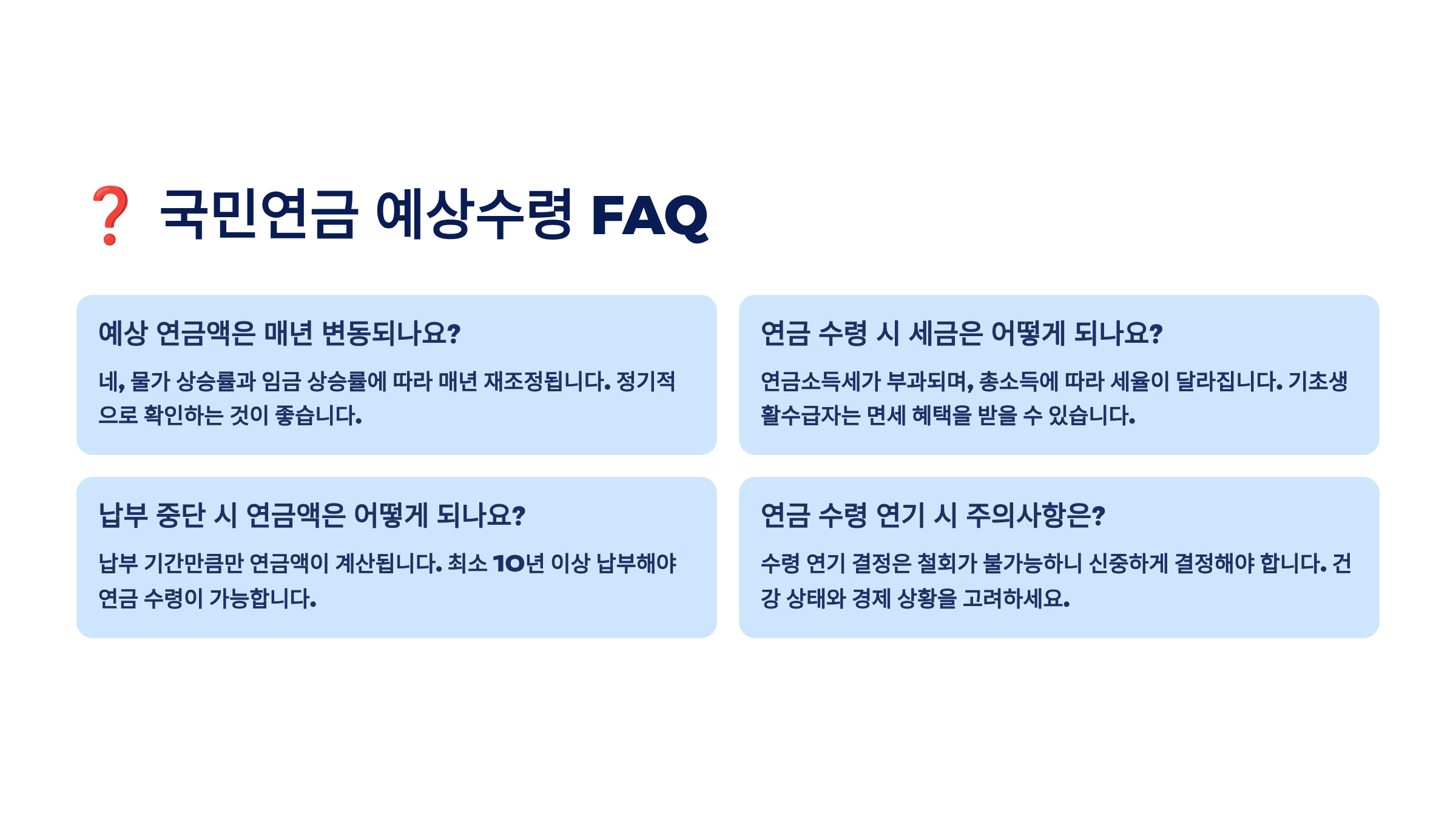 A5. 계산기는 현재 시점 기준으로 예측하므로 미래의 소득 변화, 제도 변경, 물가상승률 등에 따라 실제 수령액과 차이가 날 수 있어요. 하지만 노후 계획의 기준점으로는 충분히 신뢰할 만해요.