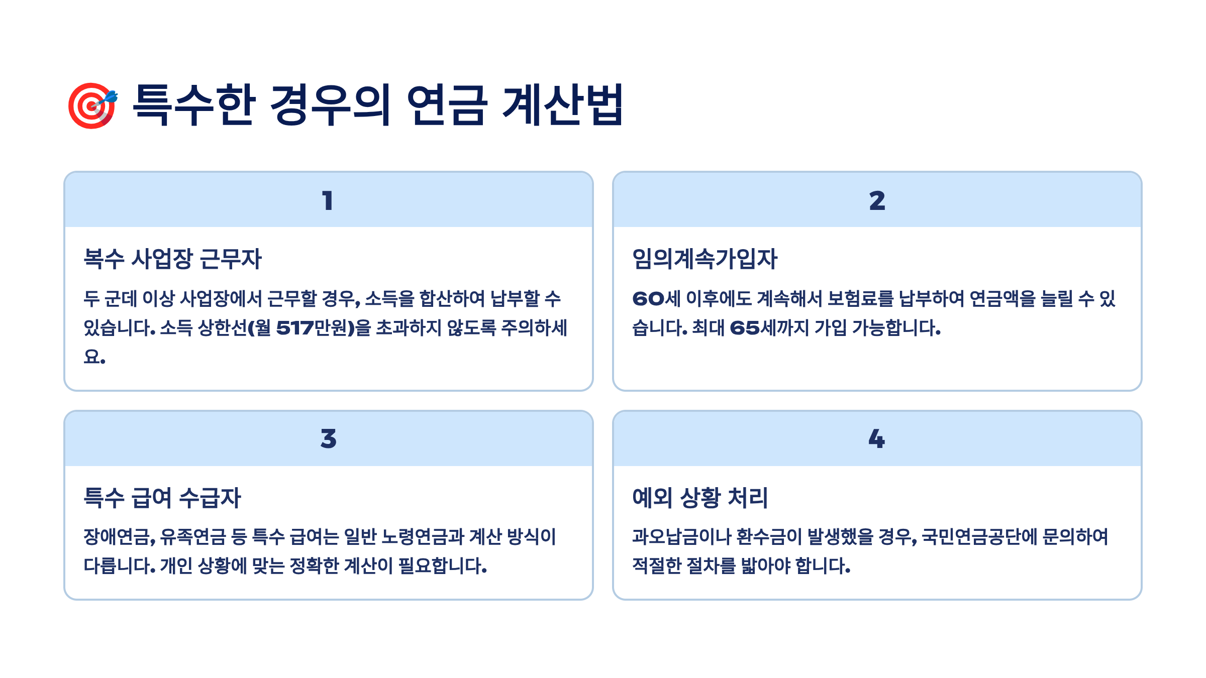 국민연금 계산은 일반적인 경우와 달리 특수한 상황에서는 다른 방식으로 적용돼요. 경력단절, 해외거주, 이혼, 재혼 등 다양한 상황에서 연금이 어떻게 계산되는지 알아두면 더 정확한 노후 설계가 가능해요. 각각의 경우에 대해 자세히 설명드릴게요! 🎯