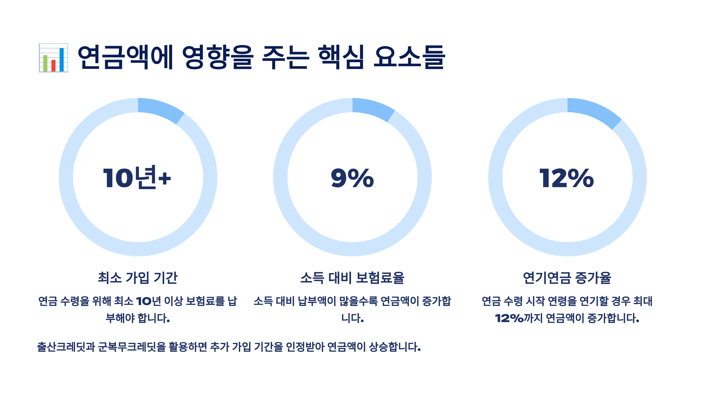 국민연금 수령액은 여러 요소들이 복합적으로 작용해서 결정돼요. 이 요소들을 제대로 이해하면 연금액을 효과적으로 늘릴 수 있는 전략을 세울 수 있답니다. 가장 중요한 세 가지 요소는 가입기간, 평균소득월액, 그리고 연금 수령 시기예요. 각각의 요소가 어떻게 영향을 미치는지 자세히 살펴볼게요! 📊