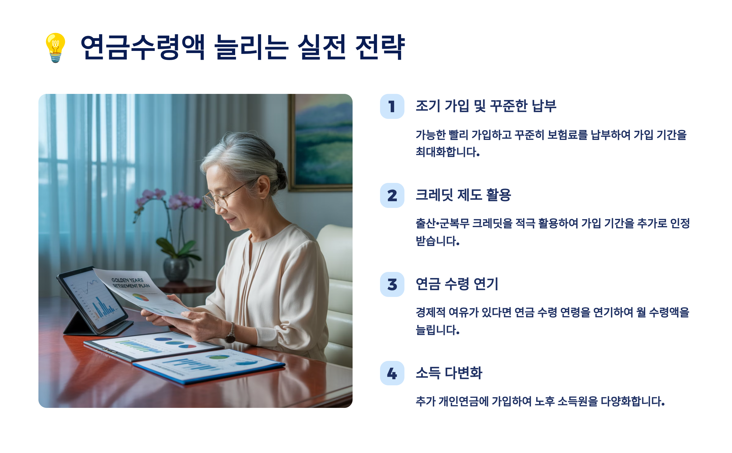 크레딧 제도들을 빠짐없이 챙기는 것도 중요해요. 출산크레딧은 둘째부터 12개월, 셋째부터는 18개월씩 최대 50개월까지 가입기간을 인정받을 수 있어요. 군복무 크레딧은 6개월 이상 복무 시 그 기간을 가입기간으로 인정해주고, 실업크레딧은 구직급여 수급 중 최대 1년간 보험료의 75%를 지원받을 수 있답니다. 이런 크레딧들을 모두 활용하면 추가 비용 없이도 연금액을 늘릴 수 있어요! 🎁