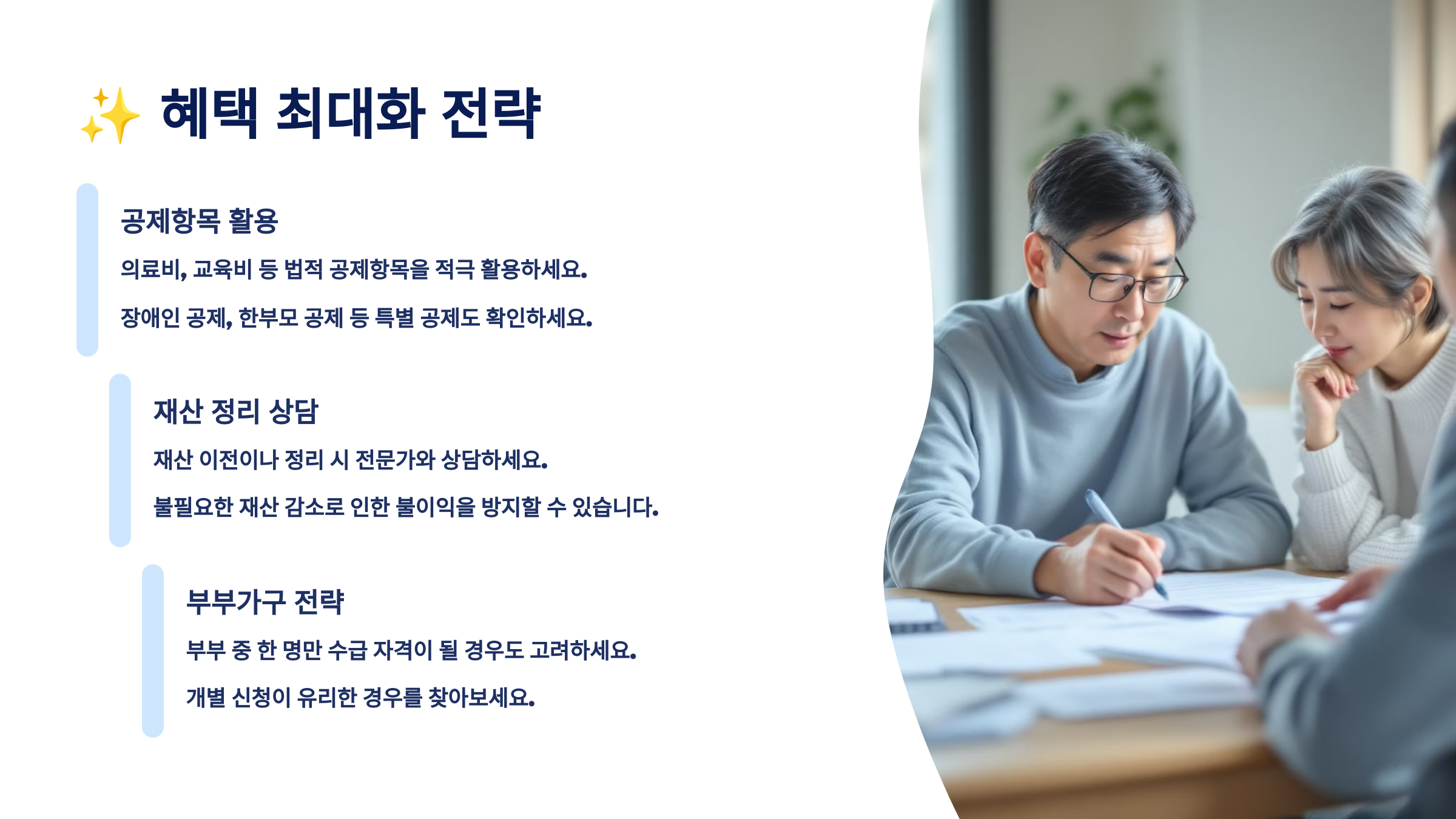 기초연금 혜택을 최대한 활용하기 위해서는 몇 가지 전략적 접근이 필요해요. 먼저 소득과 재산을 관리할 때 기초연금 기준을 고려하는 것이 중요해요. 예를 들어, 금융재산이 기준을 조금 넘는다면 일부를 생활비로 사용하거나 부채 상환에 활용해서 기준 이하로 낮출 수 있어요. 또한 부부의 경우 재산을 어떻게 분산하느냐에 따라 소득인정액이 달라질 수 있으니 전문가와 상담해보는 것도 좋은 방법이에요.