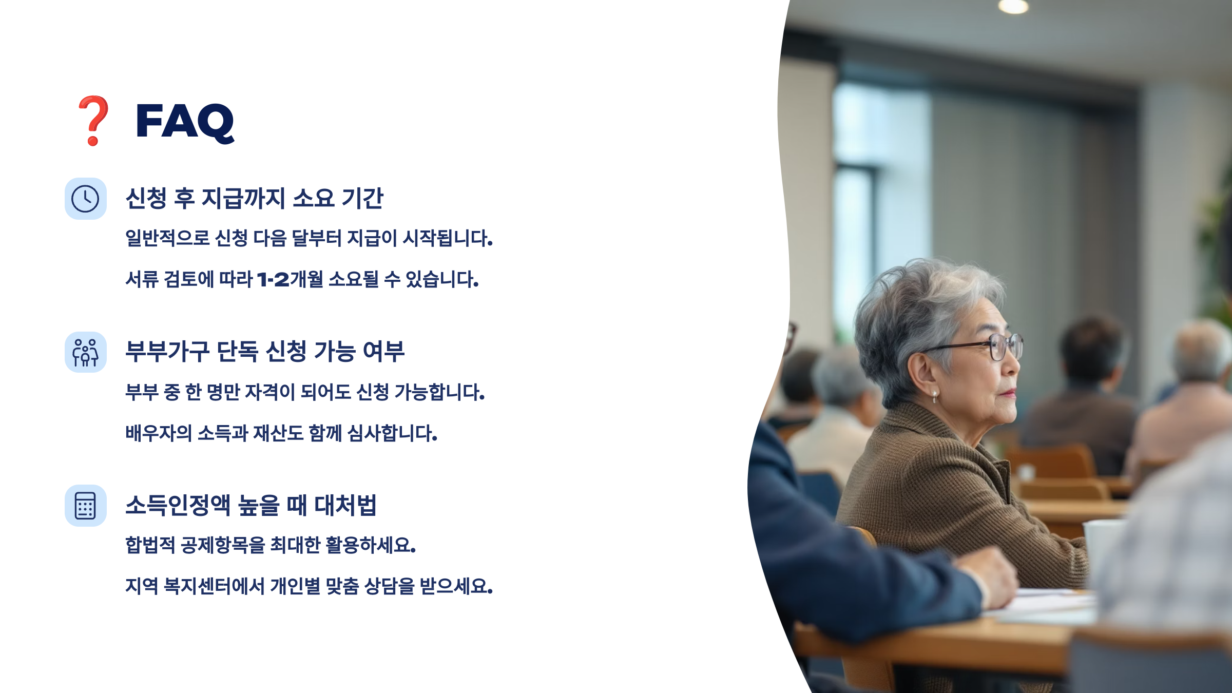 기초연금 제도에서 가장 중요한 것은 정확한 정보를 바탕으로 적극적으로 신청하는 것이에요. 소득인정액 계산이 복잡해 보이지만, 관할 기관에서 친절하게 상담해주니 걱정하지 마세요. 또한 한 번 탈락했다고 해서 포기하지 말고, 상황이 변하면 언제든 재신청할 수 있다는 점도 기억해두세요. 특히 앞으로 소득이나 재산이 줄어들 가능성이 있다면 주기적으로 재신청을 검토해보시는 것이 좋아요.