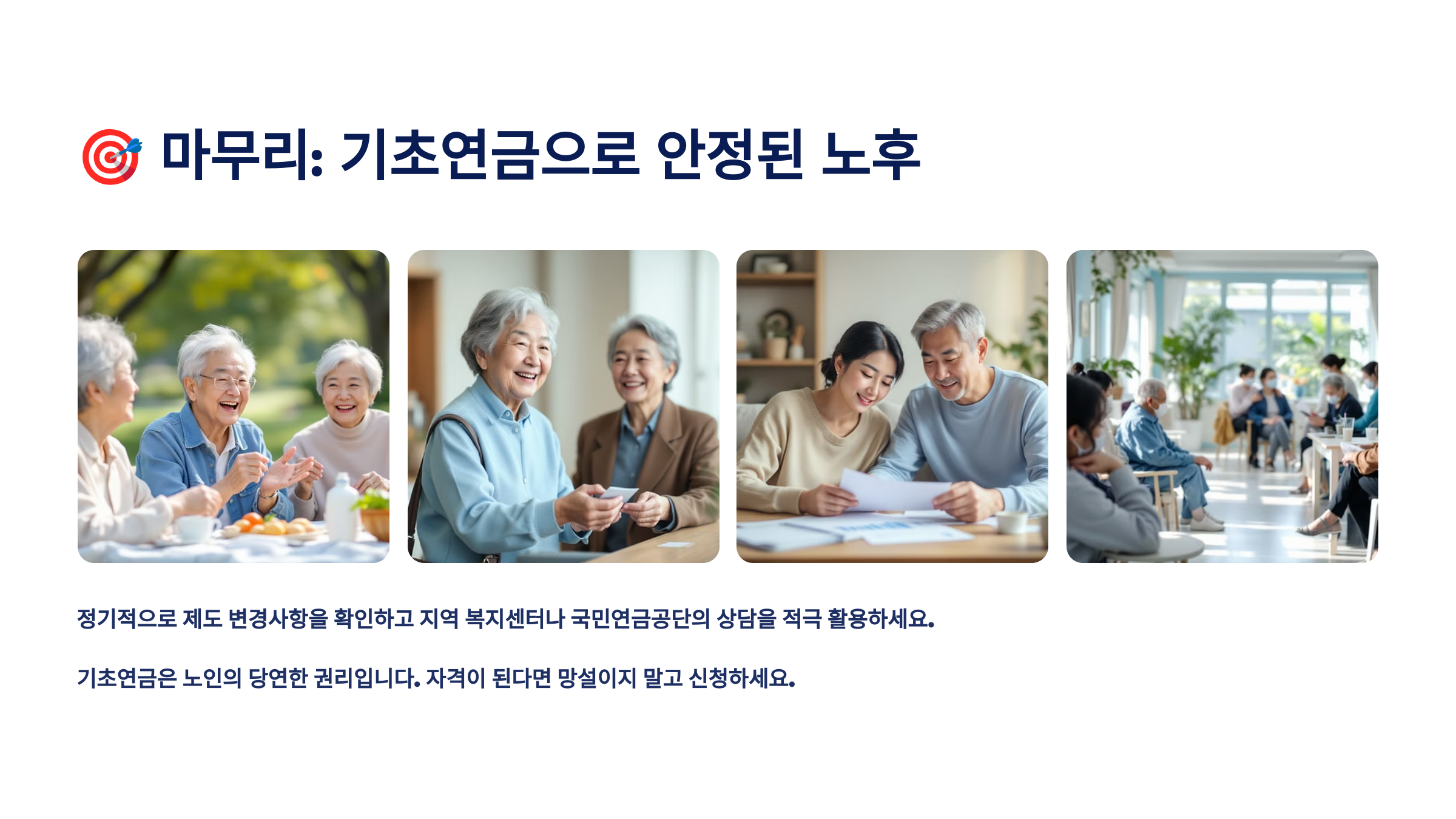 기초연금은 단순한 용돈이 아니라 어르신들이 존엄하게 노후를 보낼 수 있도록 돕는 사회적 안전망이에요. 이 제도를 통해 병원비 걱정 없이 건강을 관리하시고, 문화 활동도 즐기시며, 가족들과 함께하는 시간도 더 여유롭게 보내실 수 있을 거예요. 또한 주변의 다른 어르신들에게도 이런 정보를 나눠주시면 더 많은 분들이 혜택을 받을 수 있을 거예요. 기초연금은 우리 모두의 권리이니 적극적으로 활용하시길 바라요. 🌟