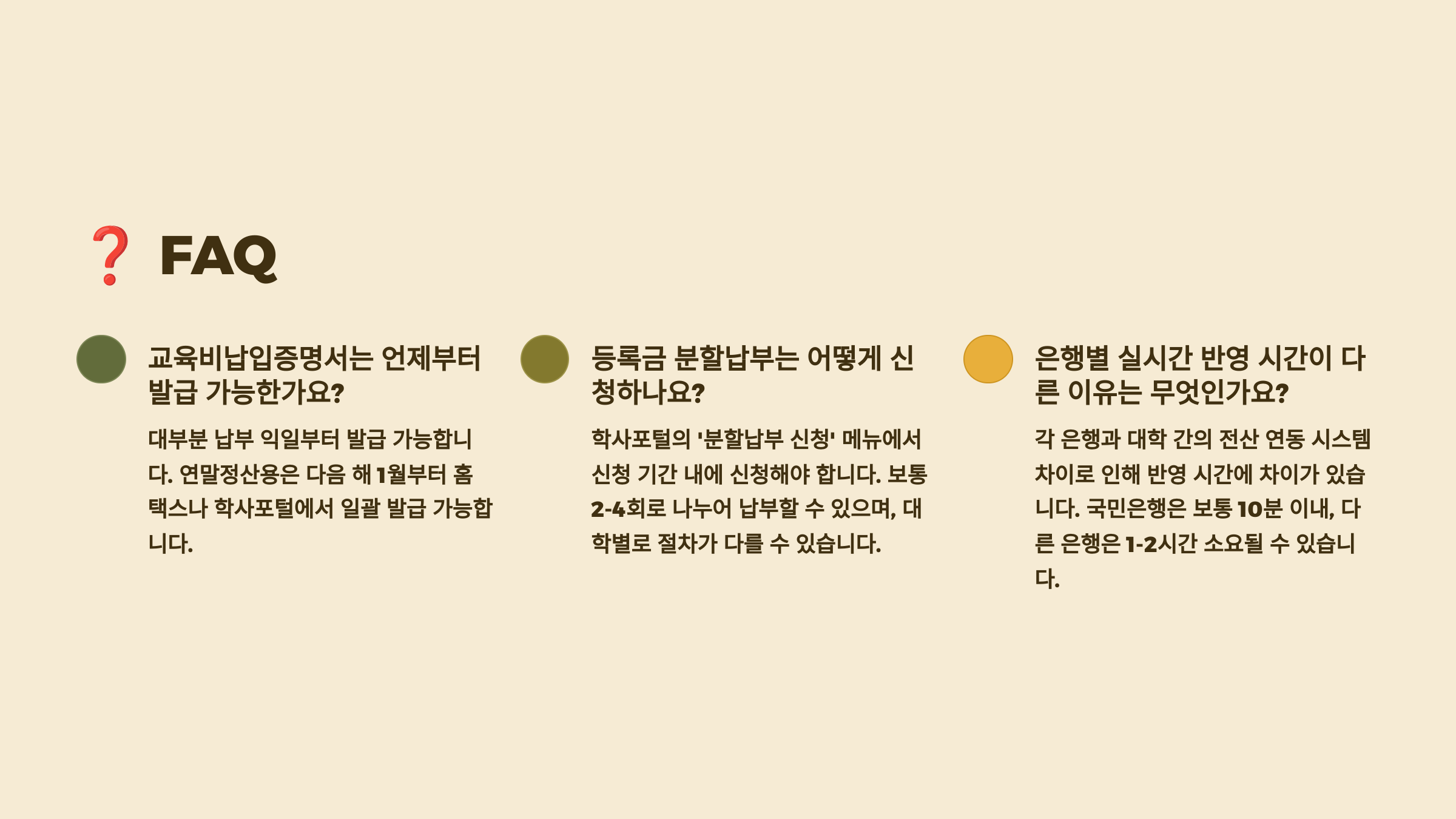 A9. 학교마다 달라요. 고정 가상계좌를 사용하는 곳도 있고, 매 학기 변경되는 곳도 있어요. 반드시 당해 학기 고지서를 확인하고 납부하세요!