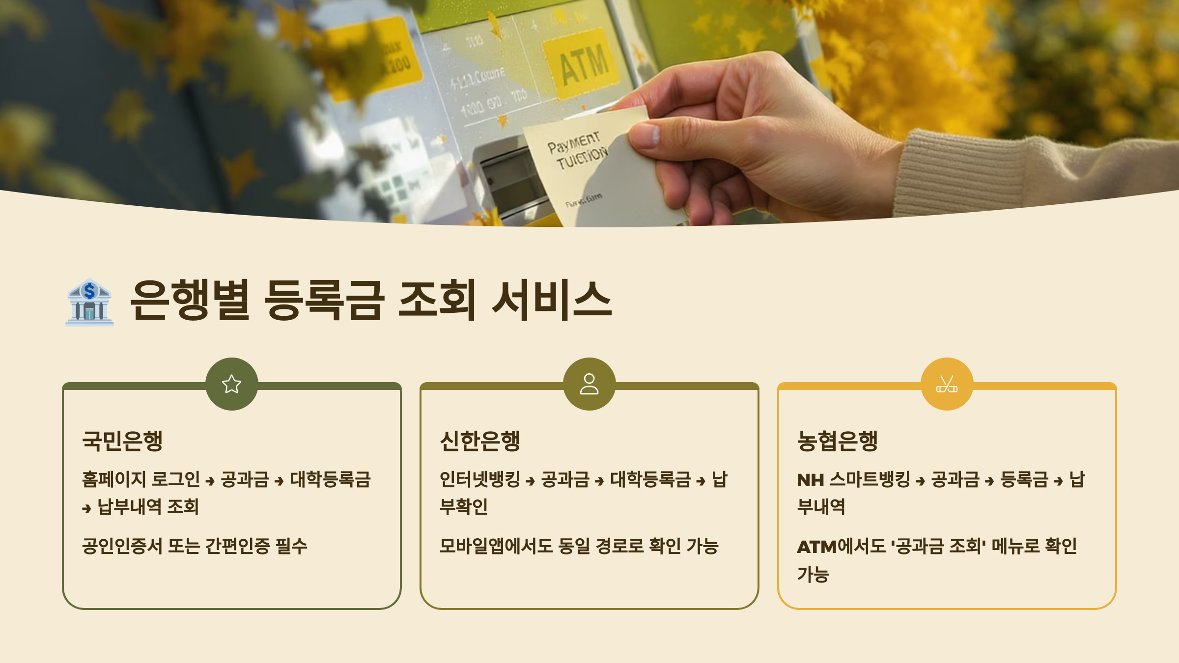 농협은행은 특히 지방 소재 대학과 연계가 잘 되어 있어요. 'NH뱅킹'에서 등록금 조회가 가능하고, 납부 영수증도 바로 출력할 수 있어요. 수협이나 신협 같은 지역 금융기관도 등록금 납부 서비스를 제공하니 확인해보세요.