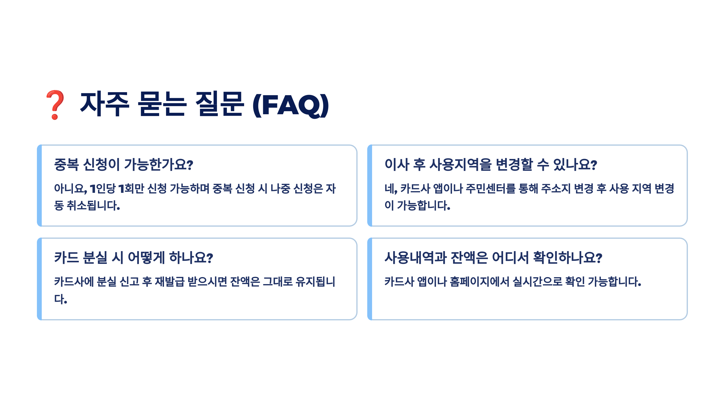 이사를 했을 때의 사용 지역 변경도 가능해요. 카드형 쿠폰(신용·체크카드)의 경우 전입신고를 완료한 후 카드사 앱이나 고객센터를 통해 사용 지역 변경을 신청할 수 있어요. 이때 주민등록등본이나 전입신고 확인서가 필요해요. 하지만 지역사랑상품권이나 선불카드는 사용 지역 변경이 불가능하니 신청 시 신중하게 선택하세요.
