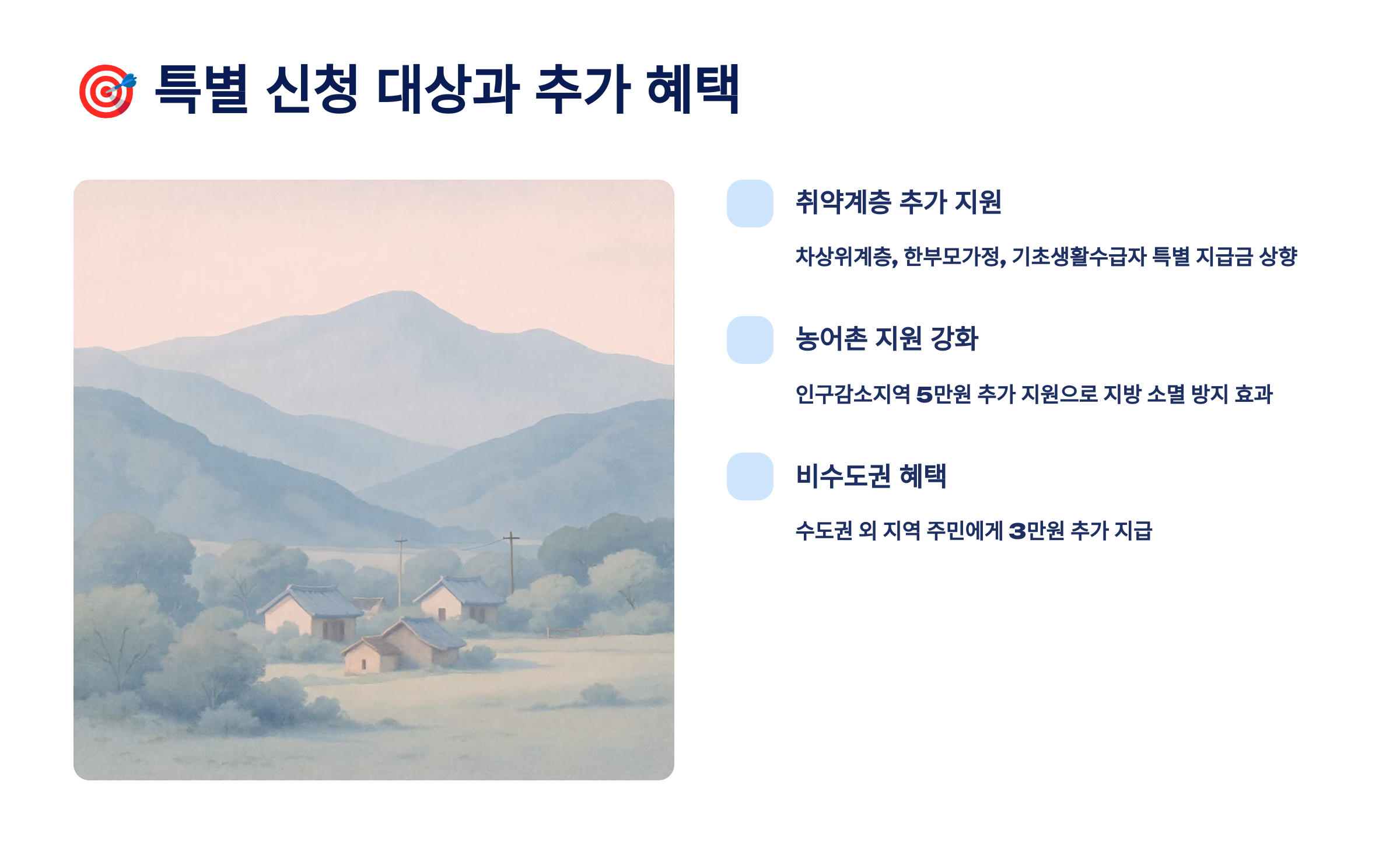 지역별 추가 지원도 주목할 만해요. 비수도권 거주자에게 3만원, 농어촌 인구감소지역 거주자에게 5만원을 추가 지급하는 것은 지역 균형 발전을 위한 정책적 배려예요. 특히 농어촌 인구감소지역 84개 시군에는 강원도 양구군, 전남 구례군, 경북 영양군 등이 포함되어 있어요. 해당 지역 거주자는 자동으로 추가 금액이 반영되니 별도 신청은 필요 없답니다.