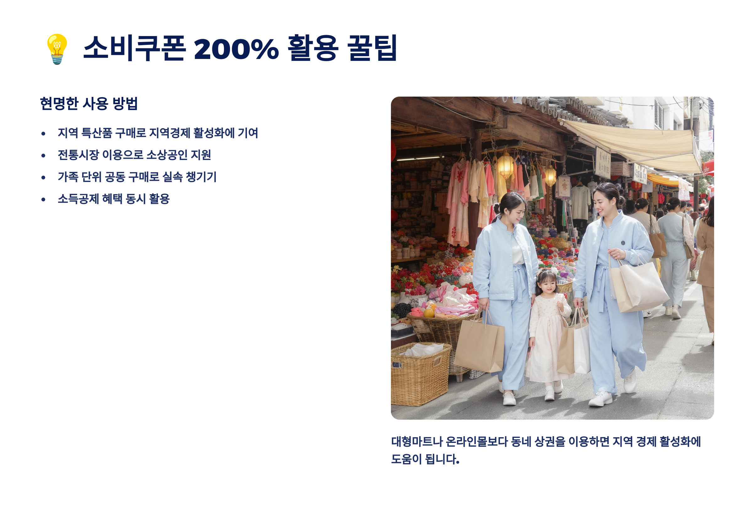 추가 혜택도 놓치지 마세요! 지역사랑상품권으로 받으면 지자체별로 5~10%의 추가 할인 혜택이 있는 경우가 많아요. 또한 전통시장에서 사용하면 온누리상품권 할인 행사와 중복 적용되는 경우도 있어요. 카드사별로도 민생회복 소비쿠폰 사용 시 추가 캐시백이나 포인트 적립 이벤트를 진행하니 꼭 확인해보세요.