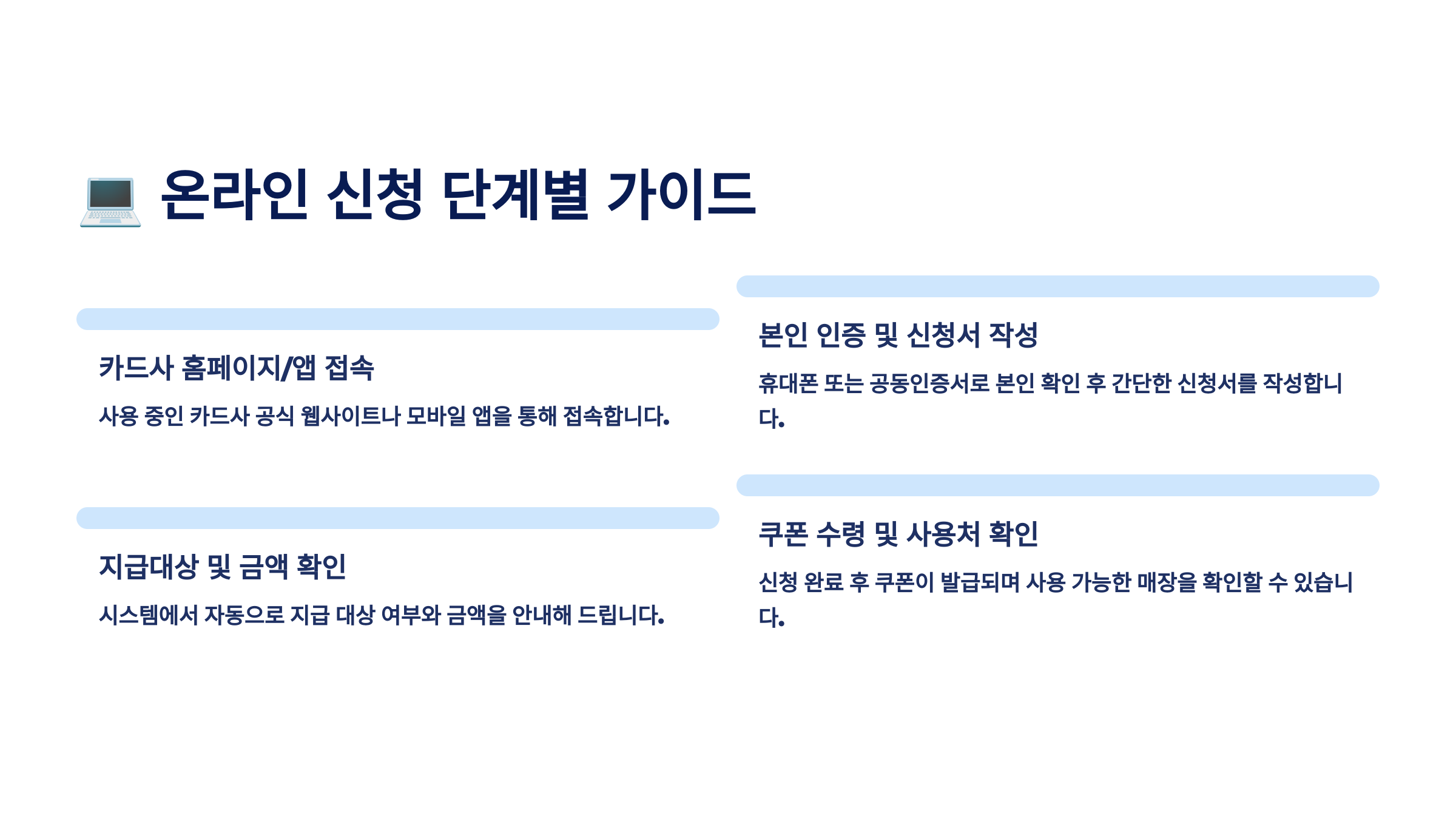 신청 방법은 온라인(카드사 앱, 홈페이지)과 오프라인(은행, 주민센터) 모두 가능하니 본인에게 편한 방법을 선택하면 돼요. 스미싱 피해를 예방하기 위해 공식 채널을 통해서만 신청하고, URL이 포함된 문자는 절대 클릭하지 마세요.