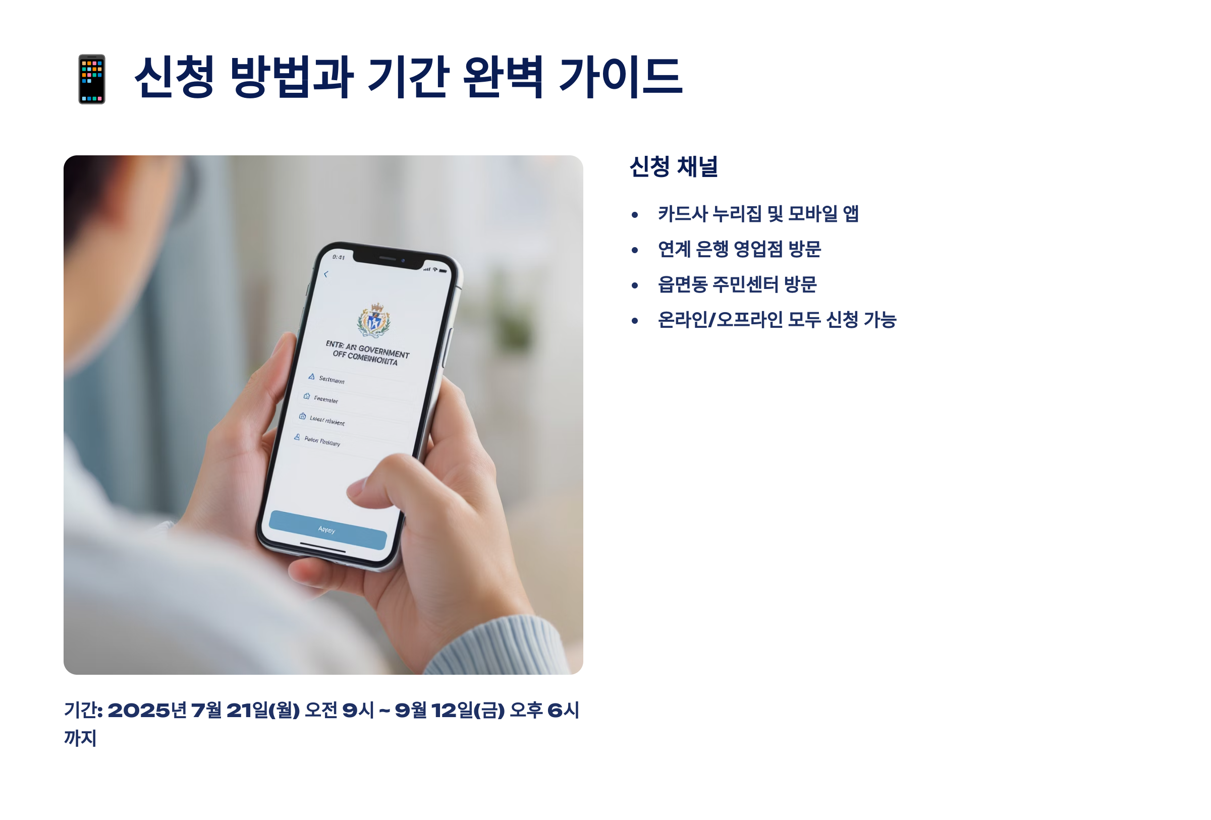 특별한 서비스도 준비되어 있어요. 거동이 불편한 고령자나 장애인을 위해 '찾아가는 신청' 서비스가 7월 28일부터 운영돼요. 주민센터에 요청하면 담당 직원이 직접 방문해서 신청을 도와드려요. 이 서비스는 혼자 거주하는 고령자나 중증 장애인 등 외출이 어려운 분들에게 큰 도움이 될 거예요.
