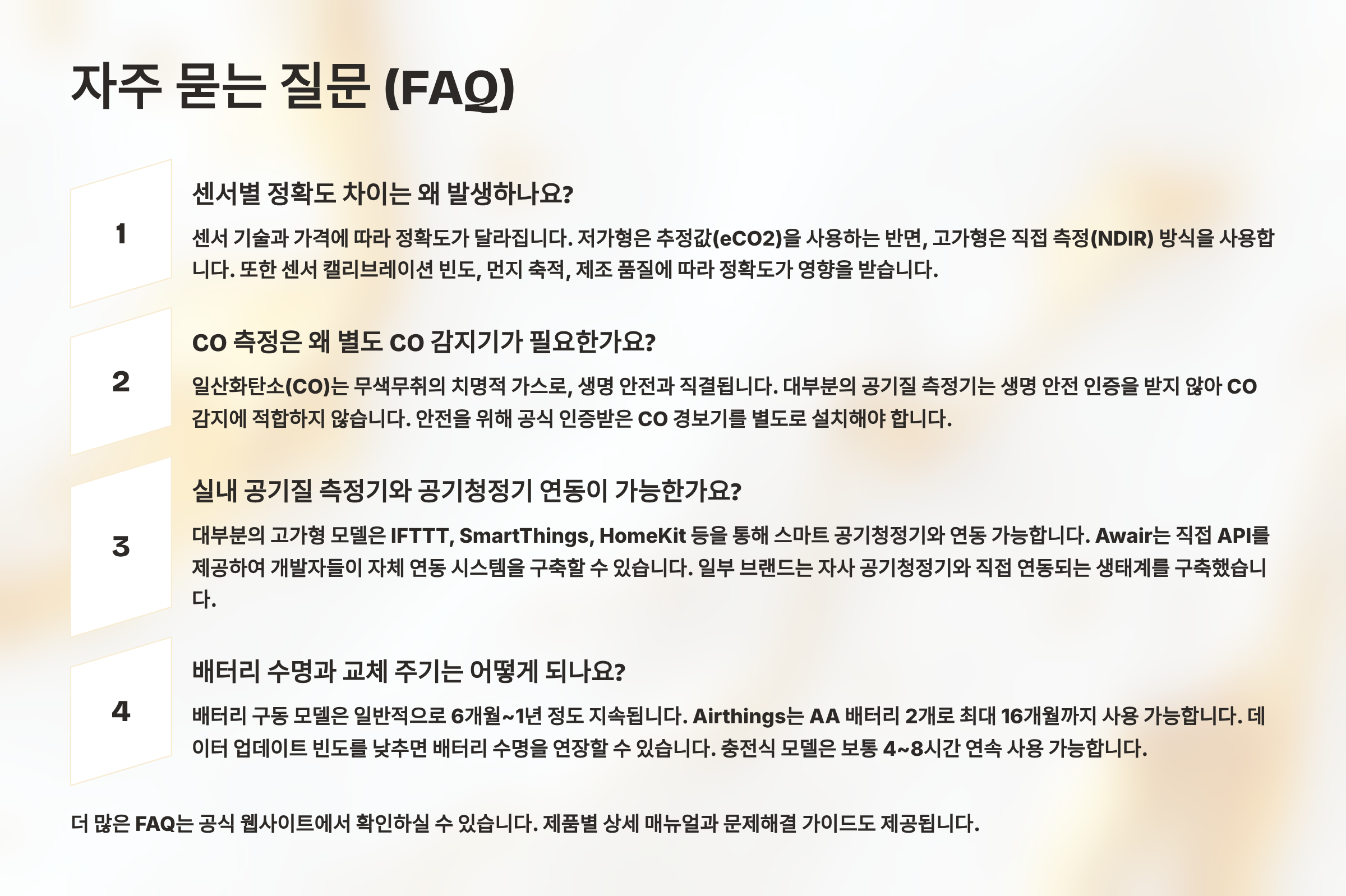 A7. 일반적으로 2-3년이지만 최신 제품은 5년까지 가능해요. CO2 센서는 5-10년, 미세먼지 센서는 2-3년, VOC 센서는 1-2년 정도입니다.