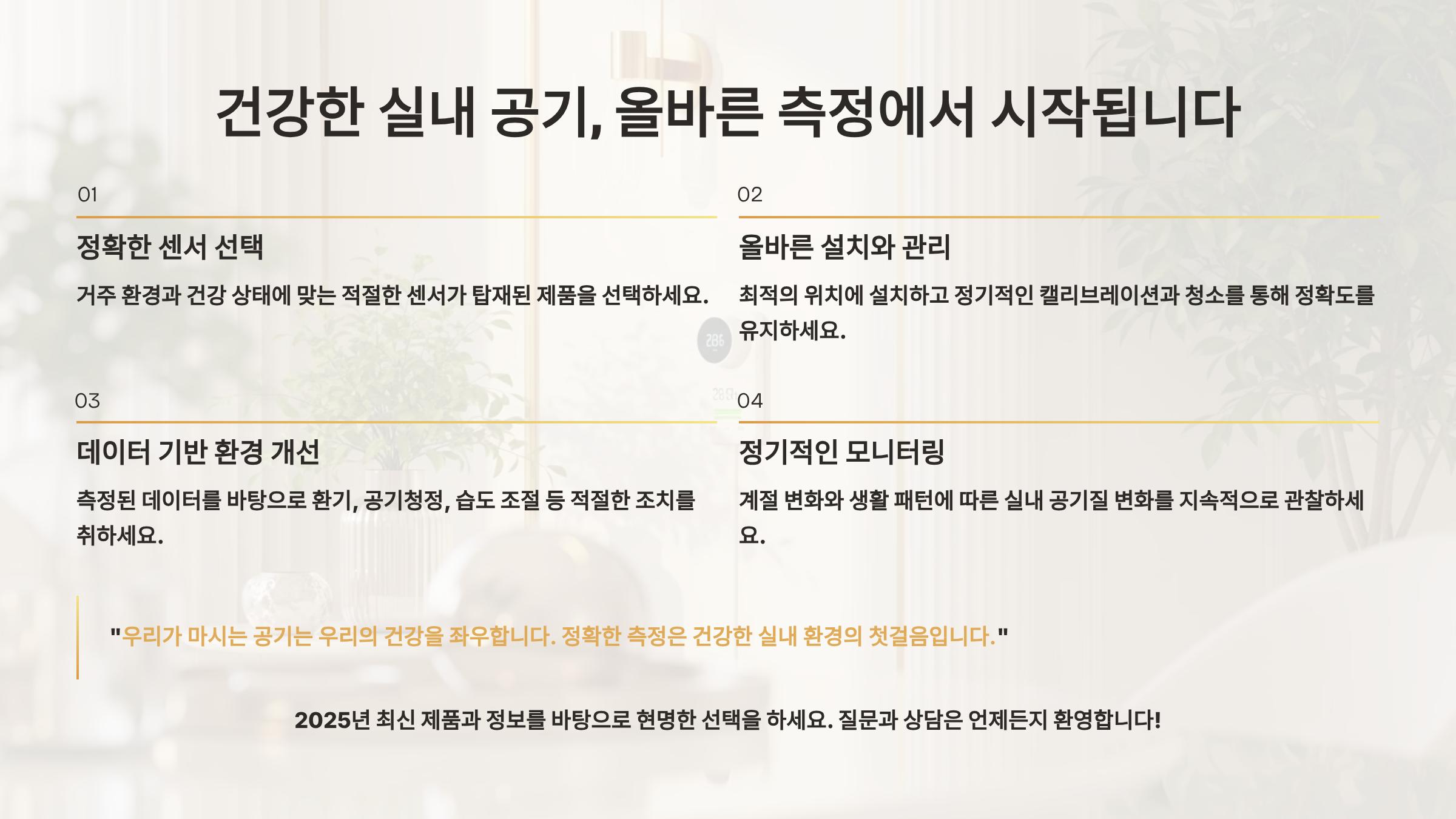 측정기는 도구일 뿐, 중요한 것은 측정 결과에 따른 적절한 조치예요. 환기, 청소, 공기청정기 가동 등 실질적인 개선 활동이 따라야 합니다. 오늘부터 우리 집 공기질 관리, 시작해보세요! 건강한 실내 환경이 여러분을 기다리고 있습니다! 🌿💨