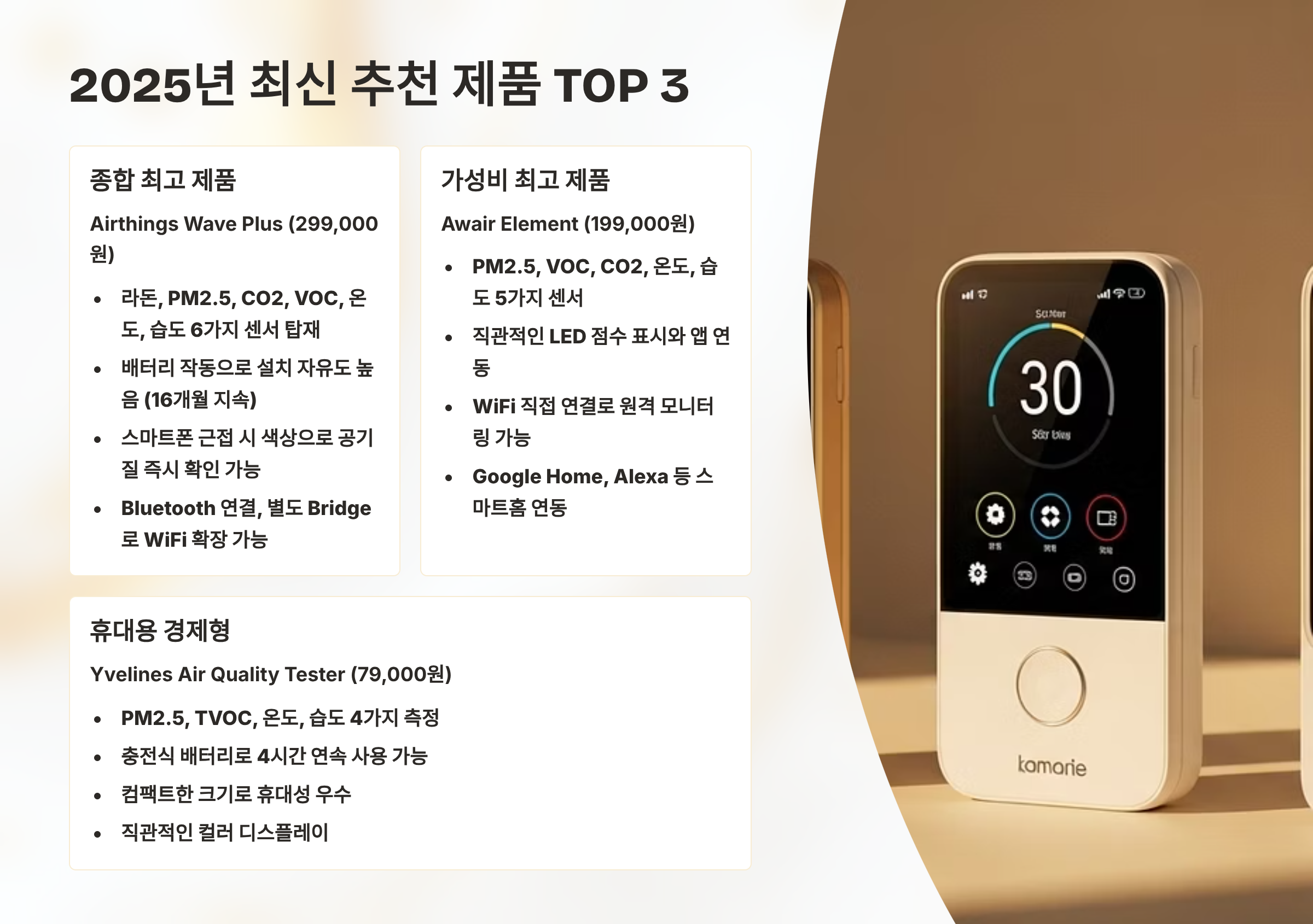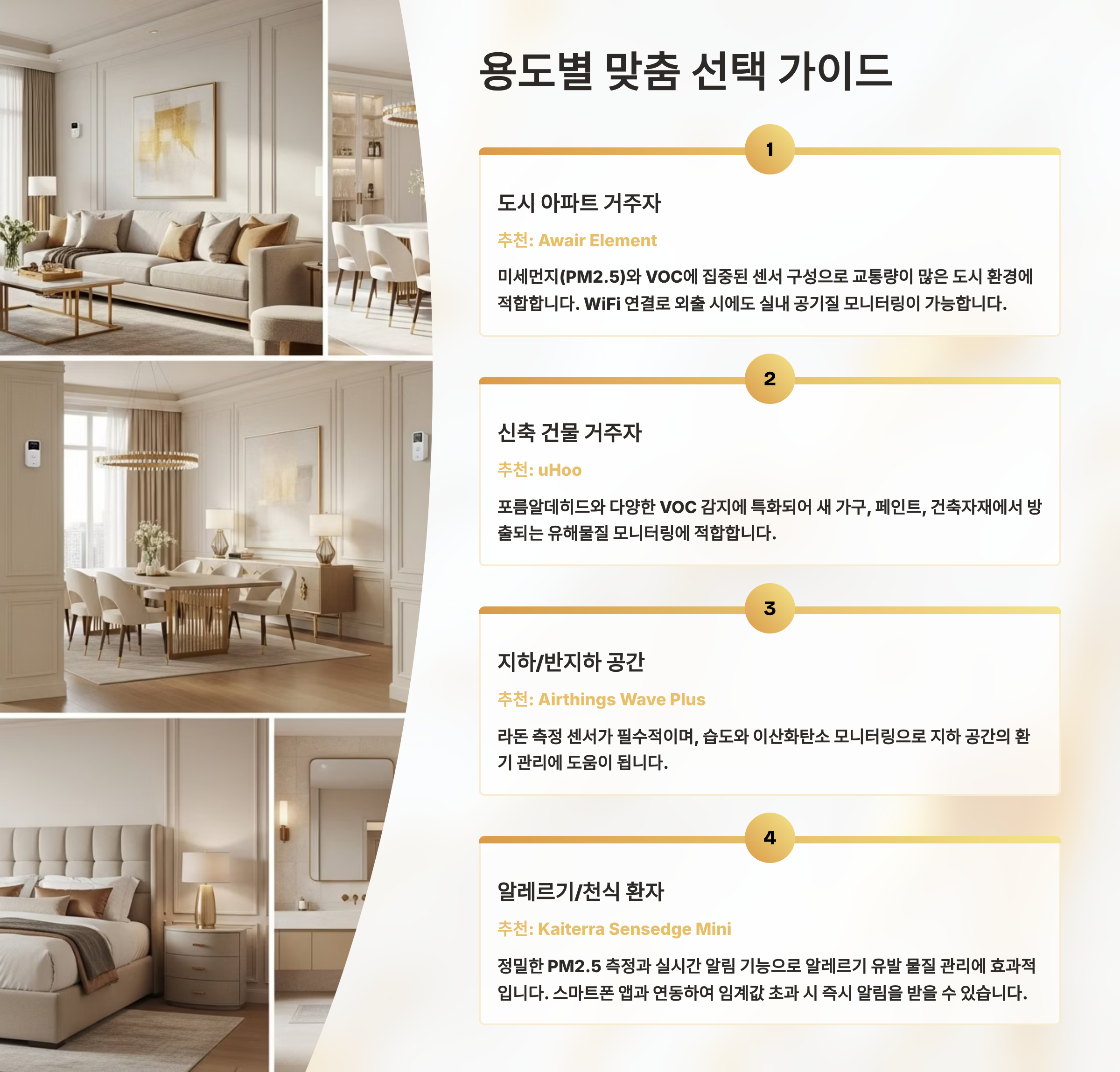 제품 선택 시 가장 중요한 것은 용도에 맞는 센서와 측정 항목이에요. 일반 가정이라면 10만원대 제품으로 충분하고, 민감군이나 아기가 있다면 VOC 측정이 가능한 고급 제품을 선택하세요.