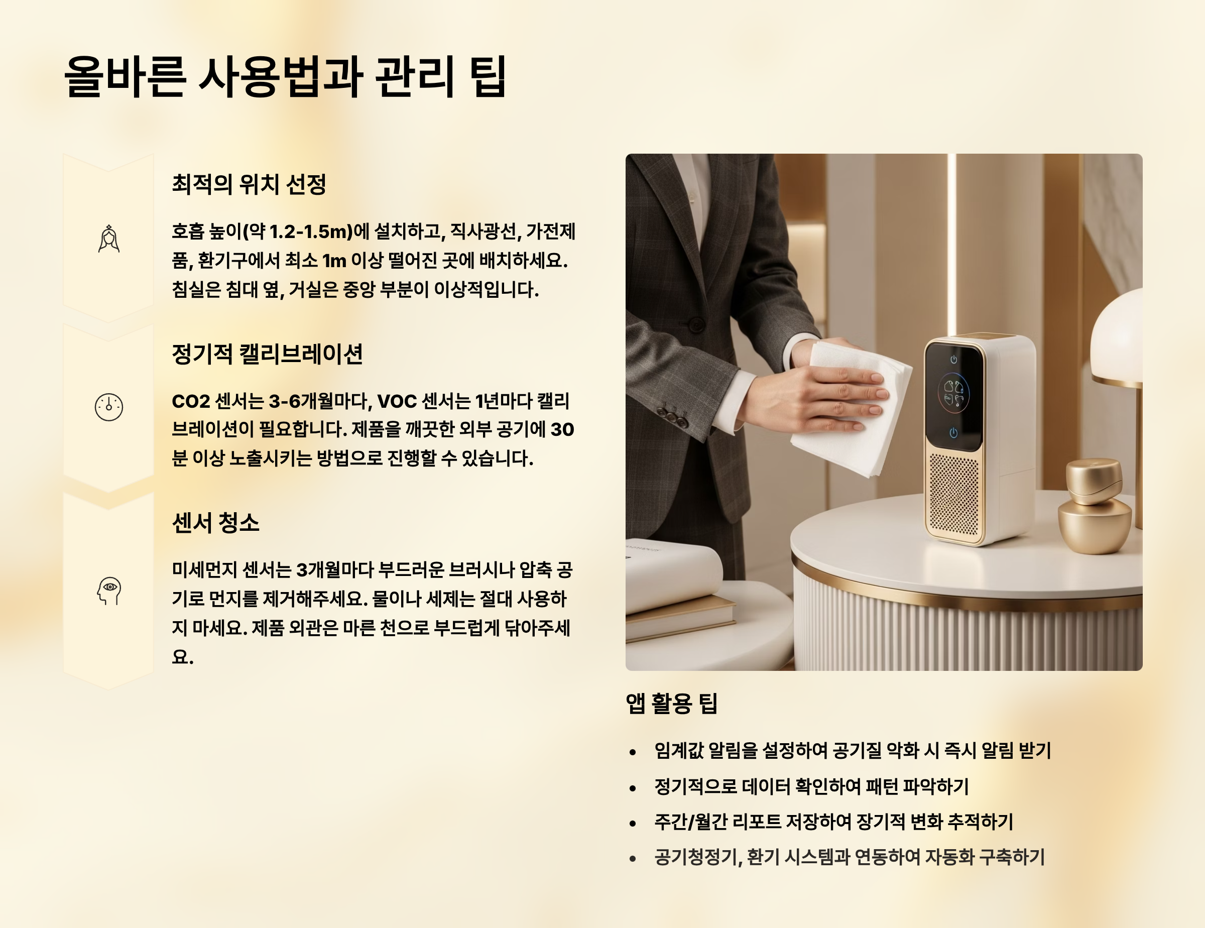 공기질 측정기를 제대로 활용하려면 올바른 설치와 관리가 필수예요! 먼저 설치 위치가 중요해요. 바닥에서 1~1.5m 높이, 벽에서 최소 50cm 떨어진 곳에 설치하세요. 창문이나 에어컨, 공기청정기 근처는 피해야 정확한 측정이 가능해요.