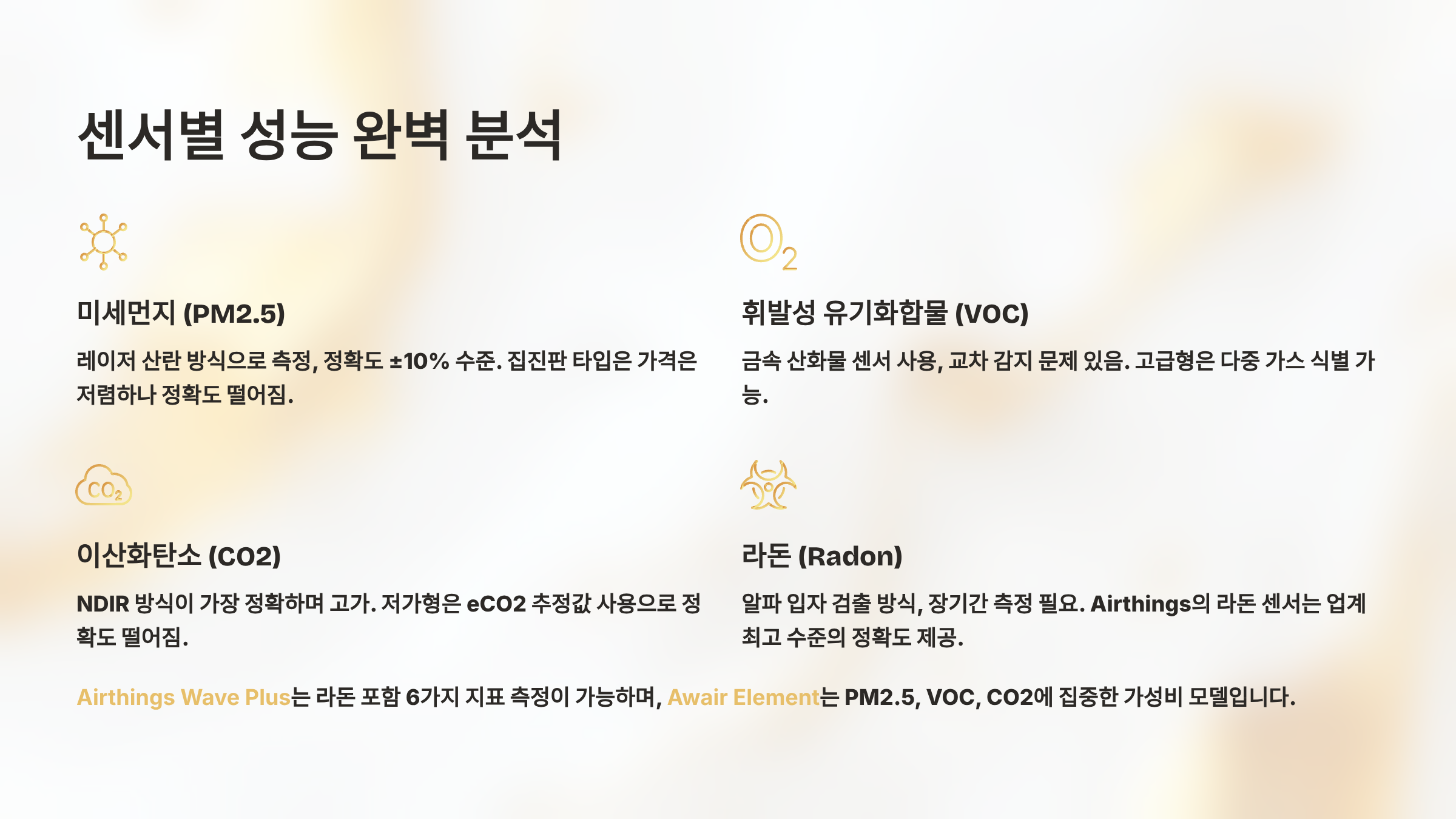 실내 공기질 측정기의 핵심은 바로 센서예요! 센서의 종류와 품질에 따라 측정 정확도가 천차만별이죠. 가장 중요한 이산화탄소(CO2) 센서부터 살펴볼게요. NDIR(비분산 적외선) 센서는 환경 영향을 덜 받고 높은 정확도를 자랑하지만 가격이 비싸요.