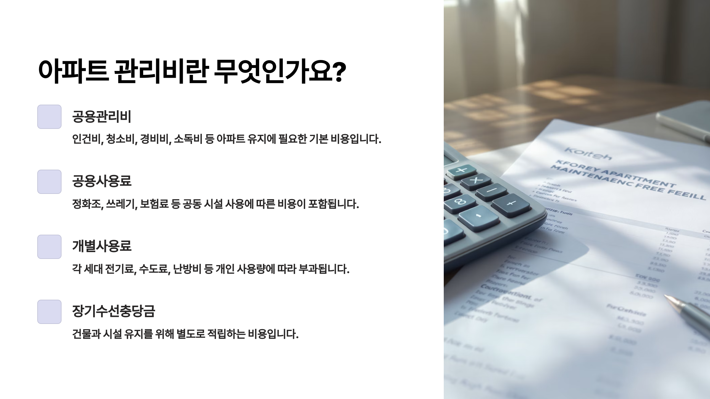 아파트 관리비는 공동주택에 거주하는 입주민들이 함께 사용하는 시설과 서비스를 유지·관리하기 위해 매달 납부하는 비용이에요. 단순히 전기료나 수도료만 포함된 게 아니라, 우리가 편안하게 생활할 수 있도록 다양한 항목들이 포함되어 있답니다.