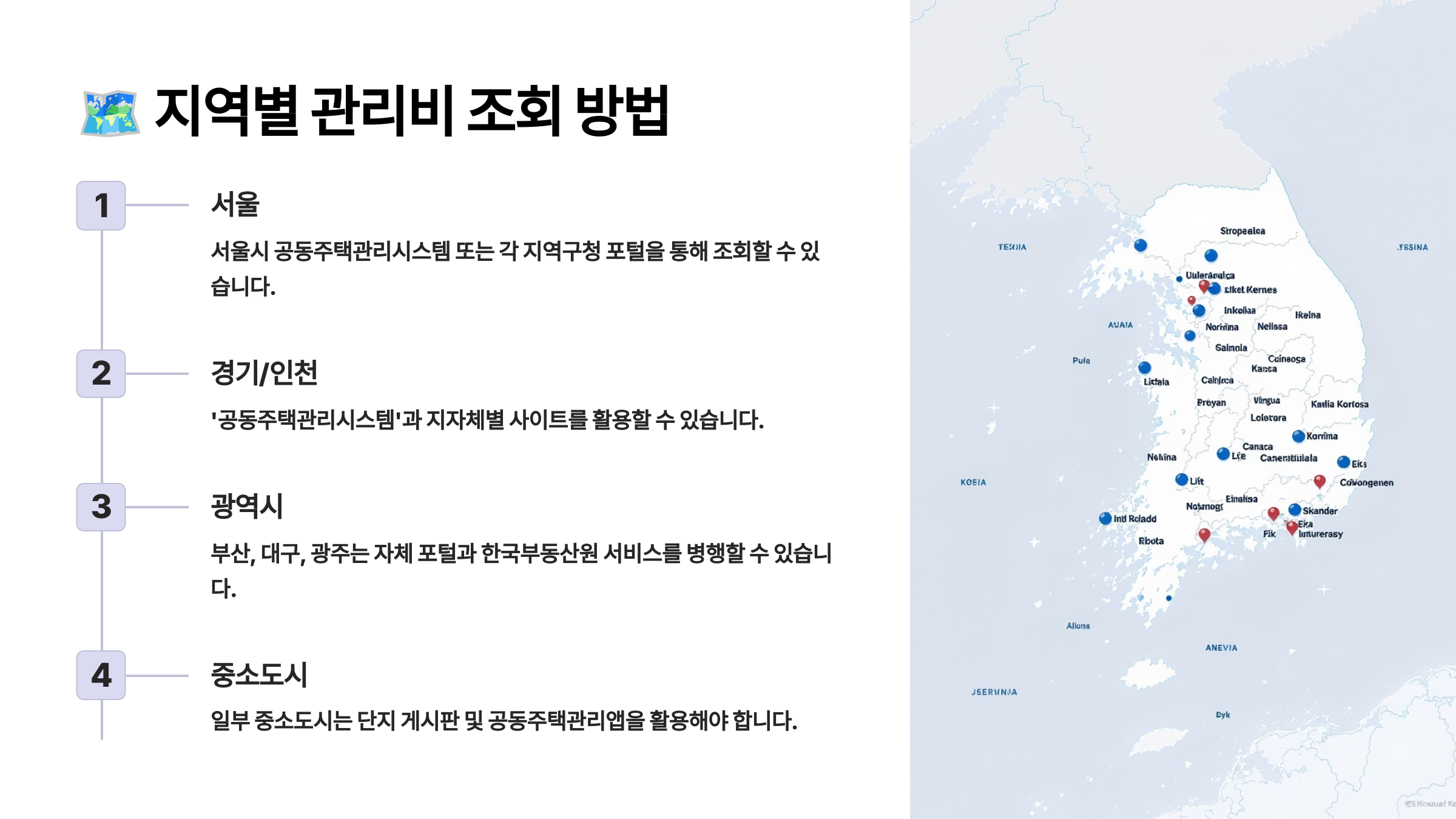 우리나라는 지역마다 아파트 문화와 관리 방식이 조금씩 달라요. 그래서 관리비 조회 방법도 지역별로 특색이 있답니다. 각 지역의 특성을 이해하고 그에 맞는 방법을 활용하면 더 효율적으로 관리비를 관리할 수 있어요!
