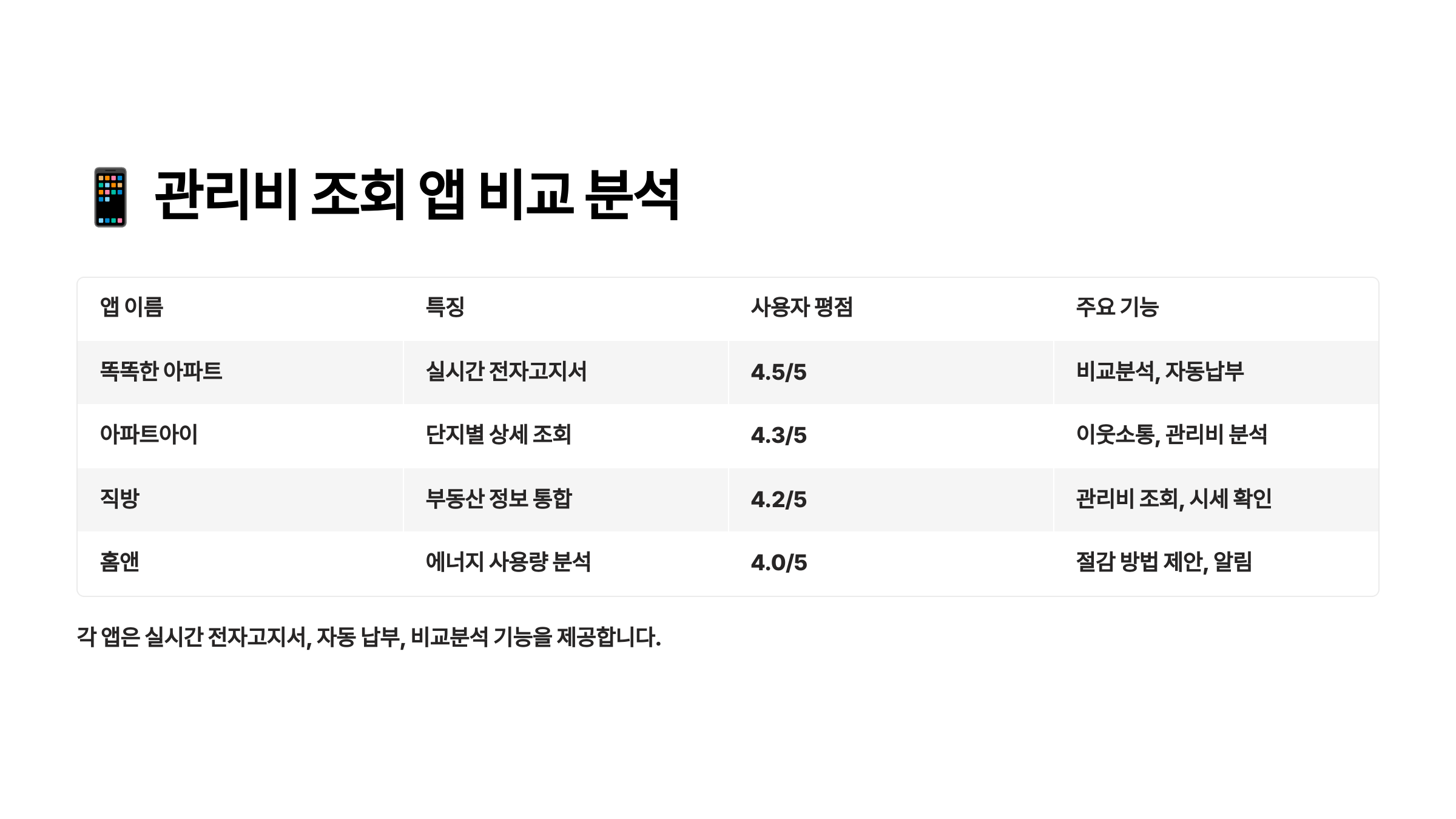 스마트폰 시대에 맞춰 관리비 조회도 모바일 앱으로 간편하게 할 수 있게 되었어요! 각 아파트 관리업체나 IT 기업들이 만든 다양한 앱들이 있는데, 각각의 특징과 장단점을 알아두면 좋답니다. 저도 여러 앱을 써보면서 느낀 점들을 공유해드릴게요.