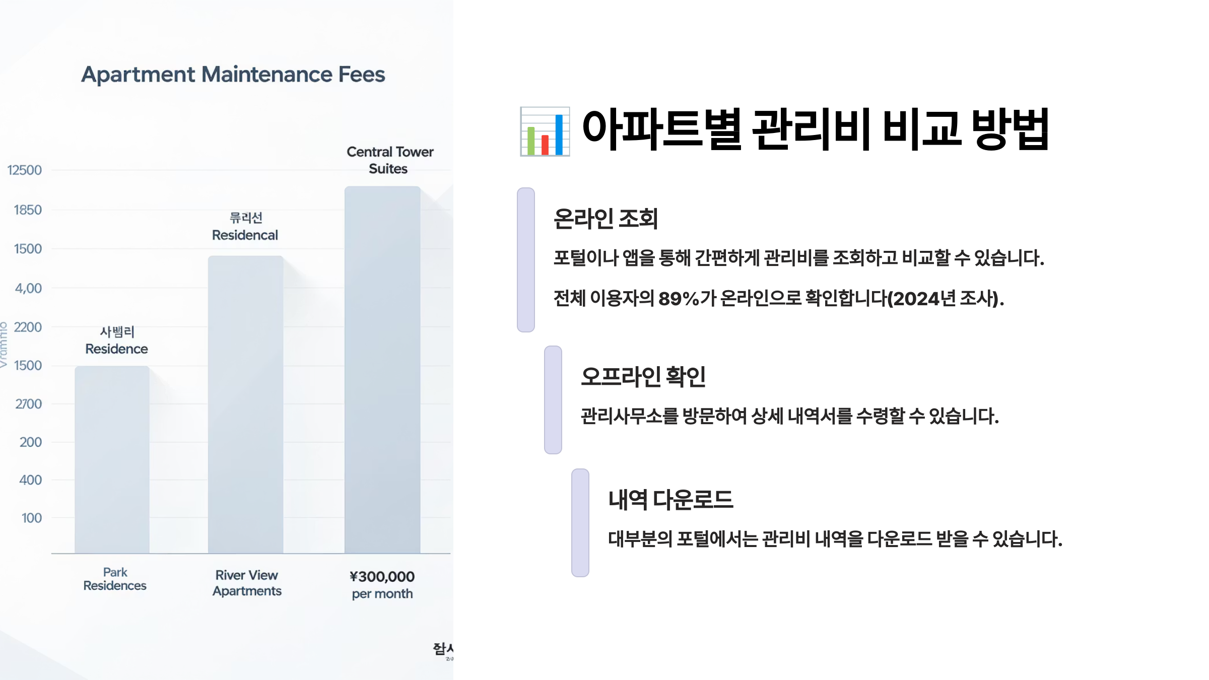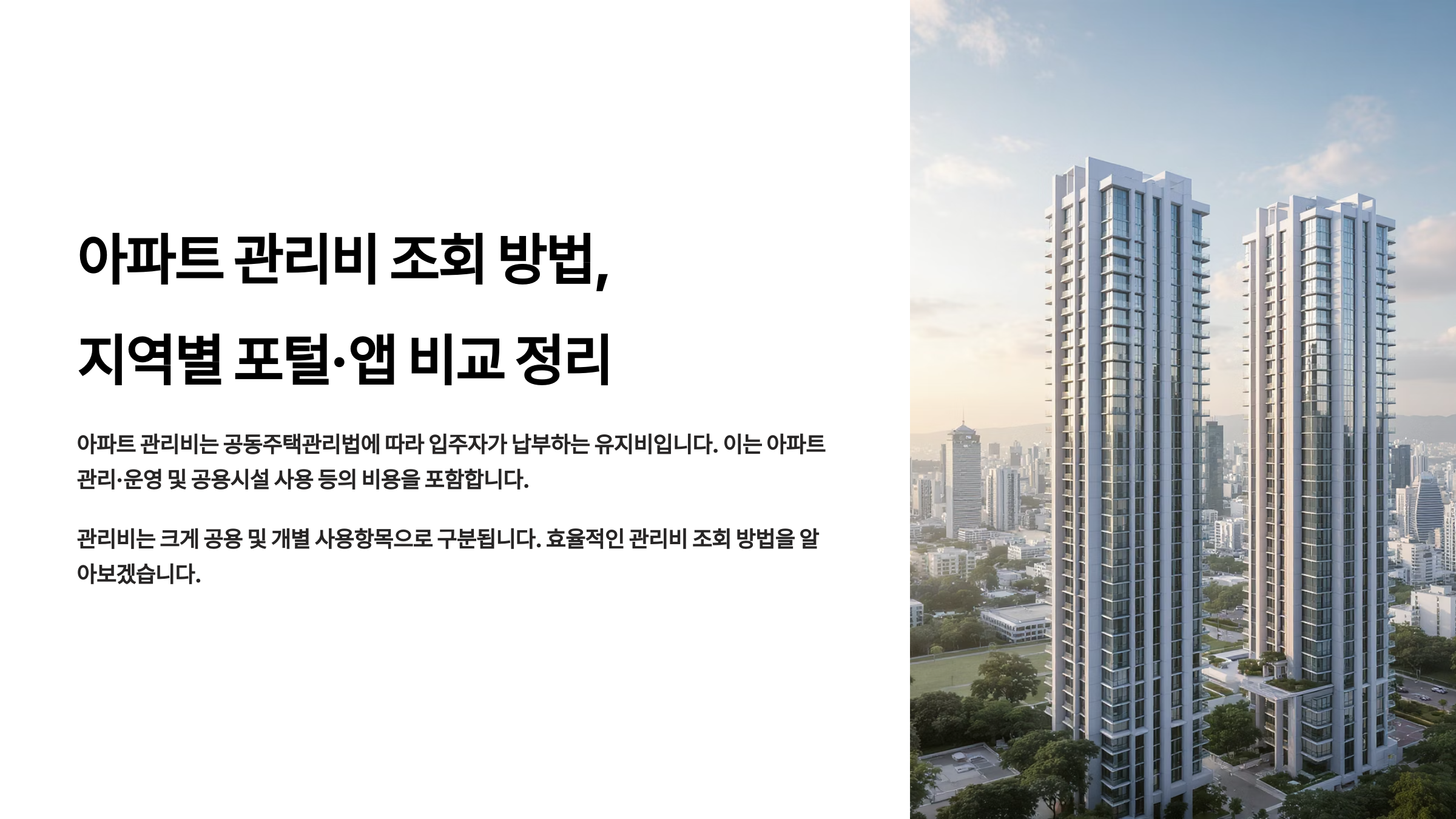아파트 관리비는 매달 고정적으로 나가는 비용이라 부담스러울 수 있어요. 하지만 요즘은 온라인으로 쉽게 조회하고 비교할 수 있는 방법이 많아졌답니다! 지역별로 다양한 포털과 앱이 있어서 우리 아파트 관리비가 적정한지 확인하고, 절감 방법도 찾을 수 있어요. 😊