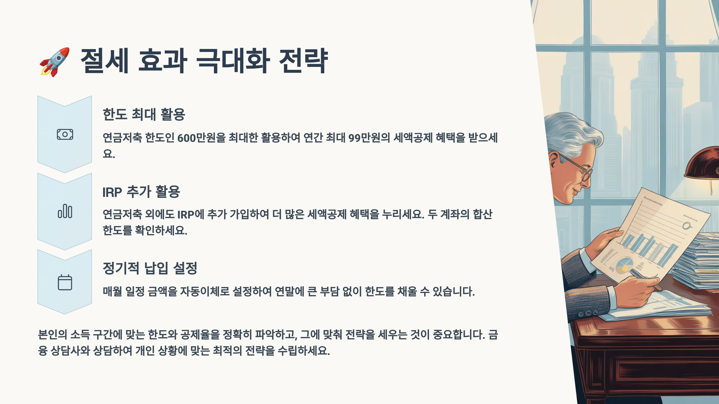 세 번째는 '타이밍 전략'이에요. 연초보다는 연말에 집중 납입하는 것도 방법이에요. 1년 동안의 소득을 확인하고 세액공제율을 정확히 계산한 후 납입할 수 있거든요. 또한 보너스나 성과급을 받는 시기에 맞춰 납입하면 자금 운용도 수월해져요.