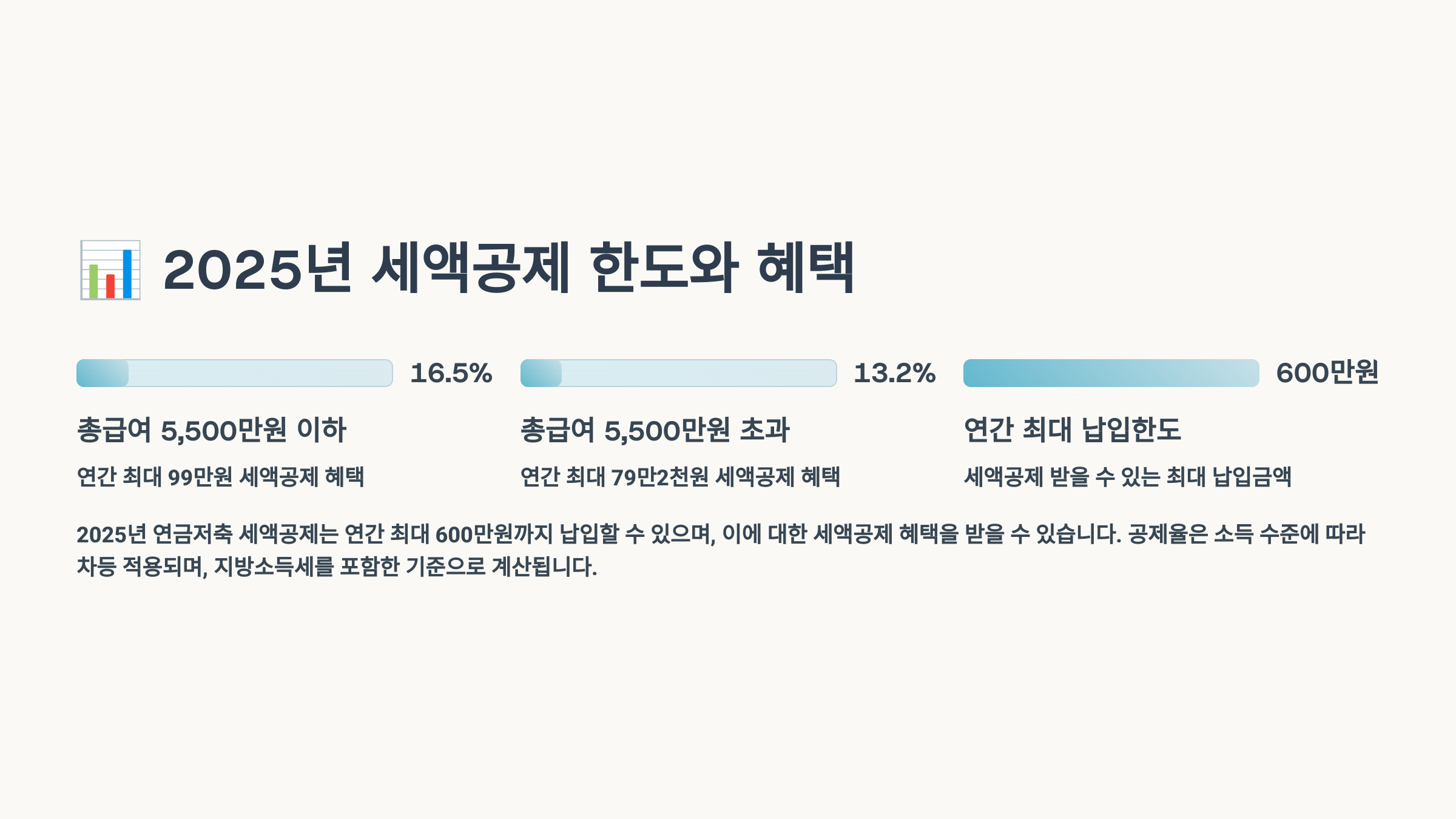연금저축 세액공제는 노후 준비와 절세를 동시에 할 수 있는 정부의 대표적인 지원 제도예요. 2025년 기준으로 연간 최대 600만원까지 납입하면 세액공제를 받을 수 있고, 소득 수준에 따라 13.2%~16.5%의 세금을 돌려받을 수 있답니다. 특히 총급여 5,500만원 이하인 경우 더 높은 공제율이 적용되어 절세 효과가 커요.
