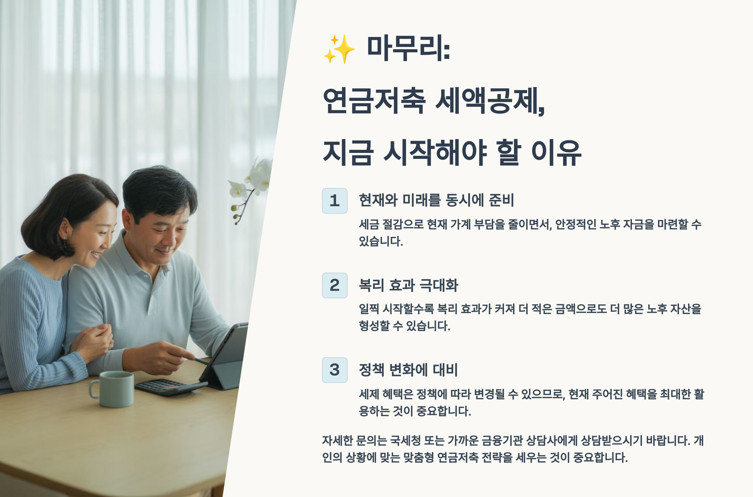지금까지 2025년 연금저축 세액공제의 모든 것을 살펴봤어요! 연금저축은 단순히 세금을 아끼는 수단이 아니라, 안정적인 노후를 준비하는 가장 확실한 방법이에요. 매년 받는 세액공제는 보너스고, 진짜 가치는 20~30년 후 은퇴했을 때 나타날 거예요. 🌟