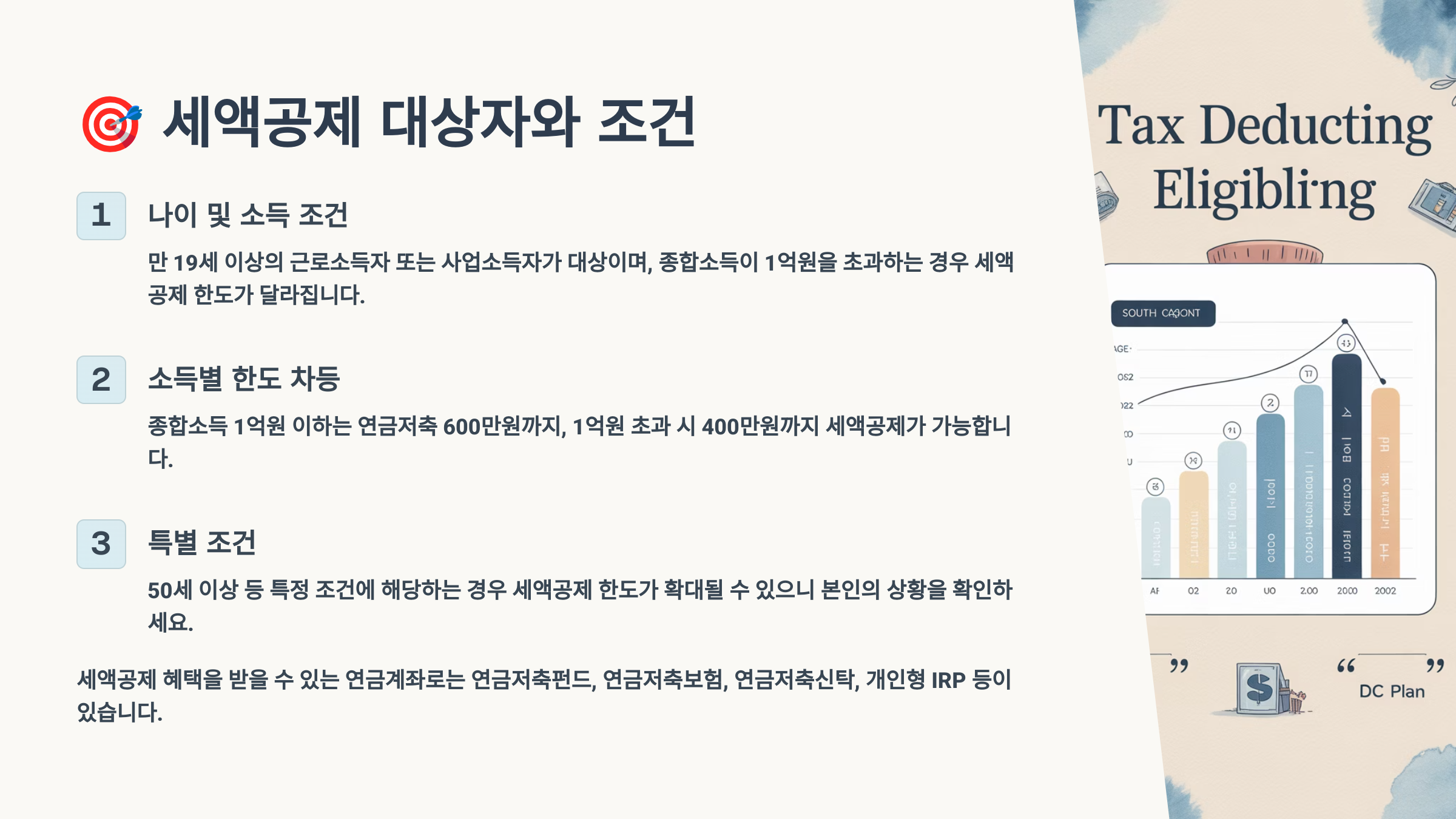 연금저축 세액공제는 소득이 있는 거주자라면 누구나 받을 수 있어요. 직장인, 자영업자, 프리랜서 모두 가능하죠! 다만 만 18세 미만이거나 소득이 없는 경우에는 가입은 가능하지만 세액공제는 받을 수 없어요. 주부나 학생도 아르바이트 등으로 소득이 있다면 공제 대상이 된답니다! 😊