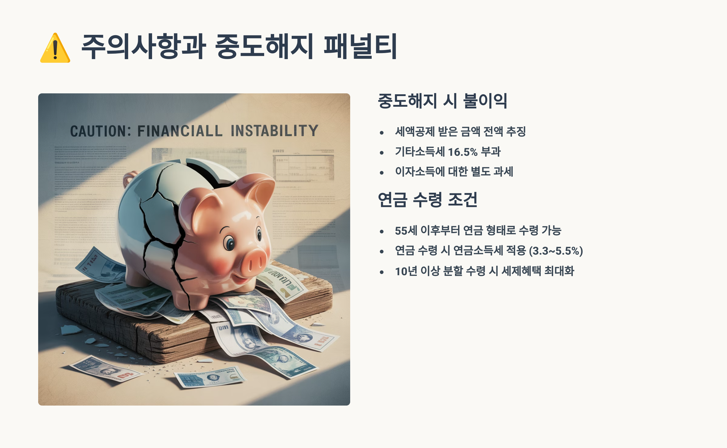 연금저축은 장기 상품이라 중도해지 시 불이익이 있어요! 가장 큰 패널티는 '추징'이에요. 5년 이내 해지하거나 55세 이전에 연금 외 수령을 하면 그동안 받은 세액공제액을 모두 토해내야 해요. 예를 들어 3년간 300만원의 세액공제를 받았다면 해지 시 300만원을 추가로 내야 한다는 뜻이죠. 😱