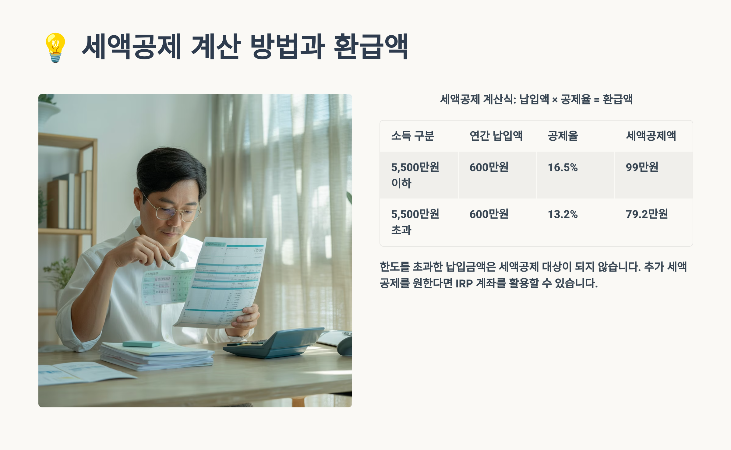 한 가지 주의할 점은 세액공제 한도가 개인별로 적용된다는 거예요. 부부가 각자 연금저축에 가입하면 각각 공제받을 수 있어요. 맞벌이 부부라면 두 사람 모두 한도를 채우는 게 절세에 유리하답니다. 소득이 적은 배우자도 최소한의 금액이라도 납입하는 걸 추천드려요.