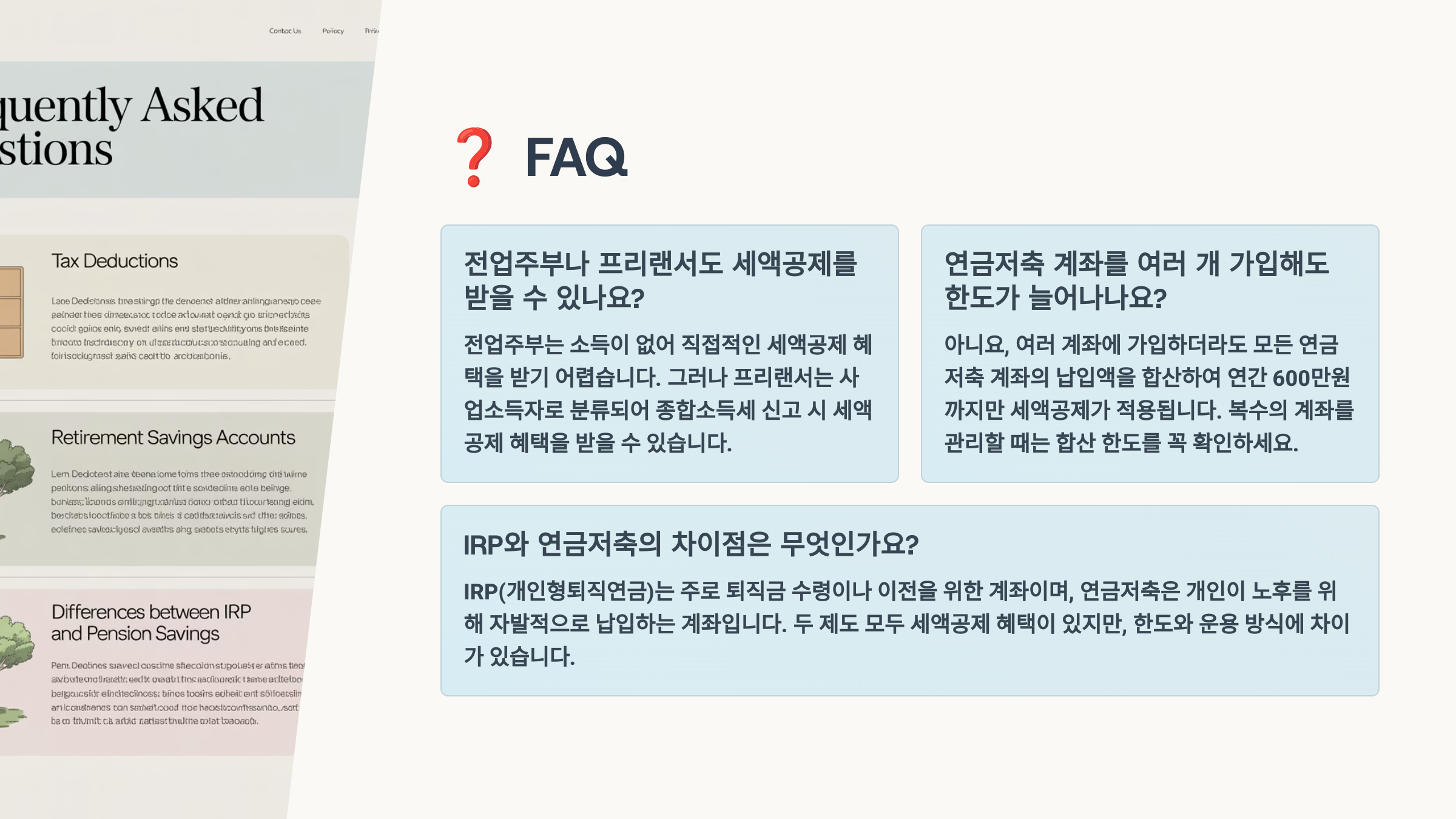 A1. 연금저축은 개인이 자유롭게 가입하는 상품이고, IRP(개인형퇴직연금)는 퇴직금을 받을 수 있는 계좌예요. IRP는 퇴직금 이전이 가능하고 추가 납입도 할 수 있어요. 세액공제 한도는 합산해서 적용되니 둘 다 활용하면 더 많은 혜택을 받을 수 있답니다!