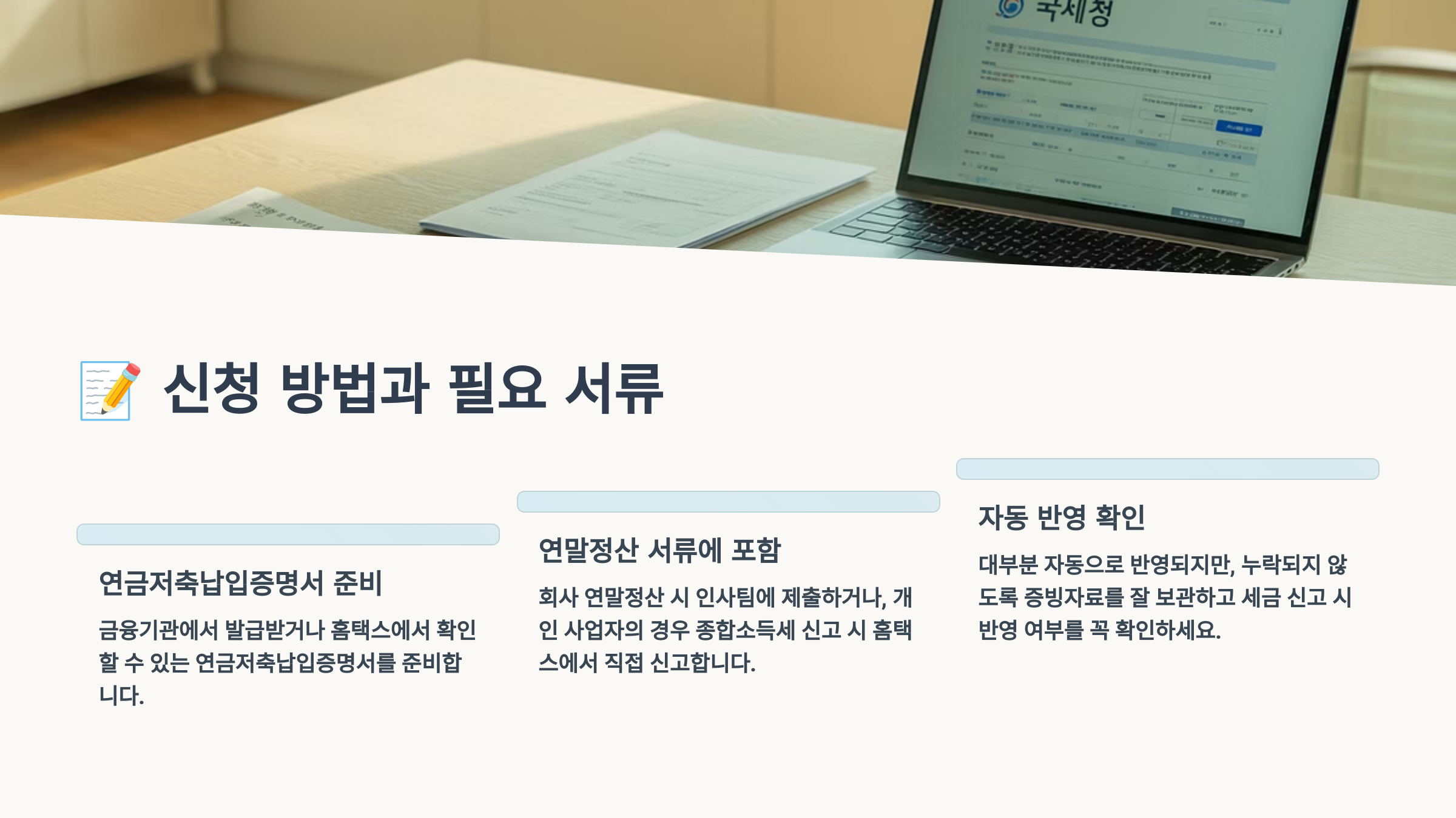 세액공제를 받으려면 연말정산이나 종합소득세 신고 때 신청해야 해요. 회사원이라면 연말정산 간소화 서비스에서 자동으로 조회되니 편리하죠. 자영업자나 프리랜서는 5월 종합소득세 신고 때 직접 입력해야 해요. 금융기관에서 발급한 납입증명서를 꼭 챙기세요!