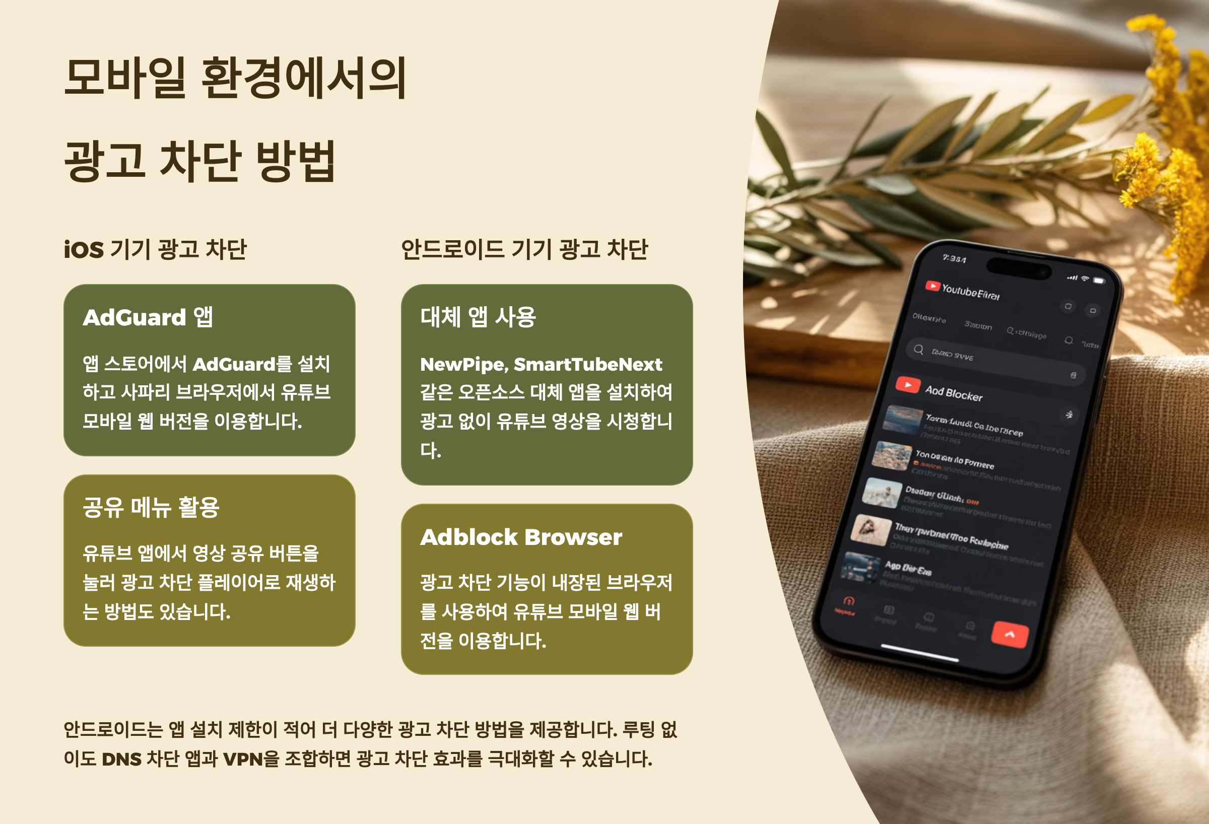 A4. 안드로이드는 NewPipe 앱 설치가 가장 간단해요. iOS는 사파리 브라우저에서 AdGuard 확장 프로그램을 사용하는 방법을 추천합니다.