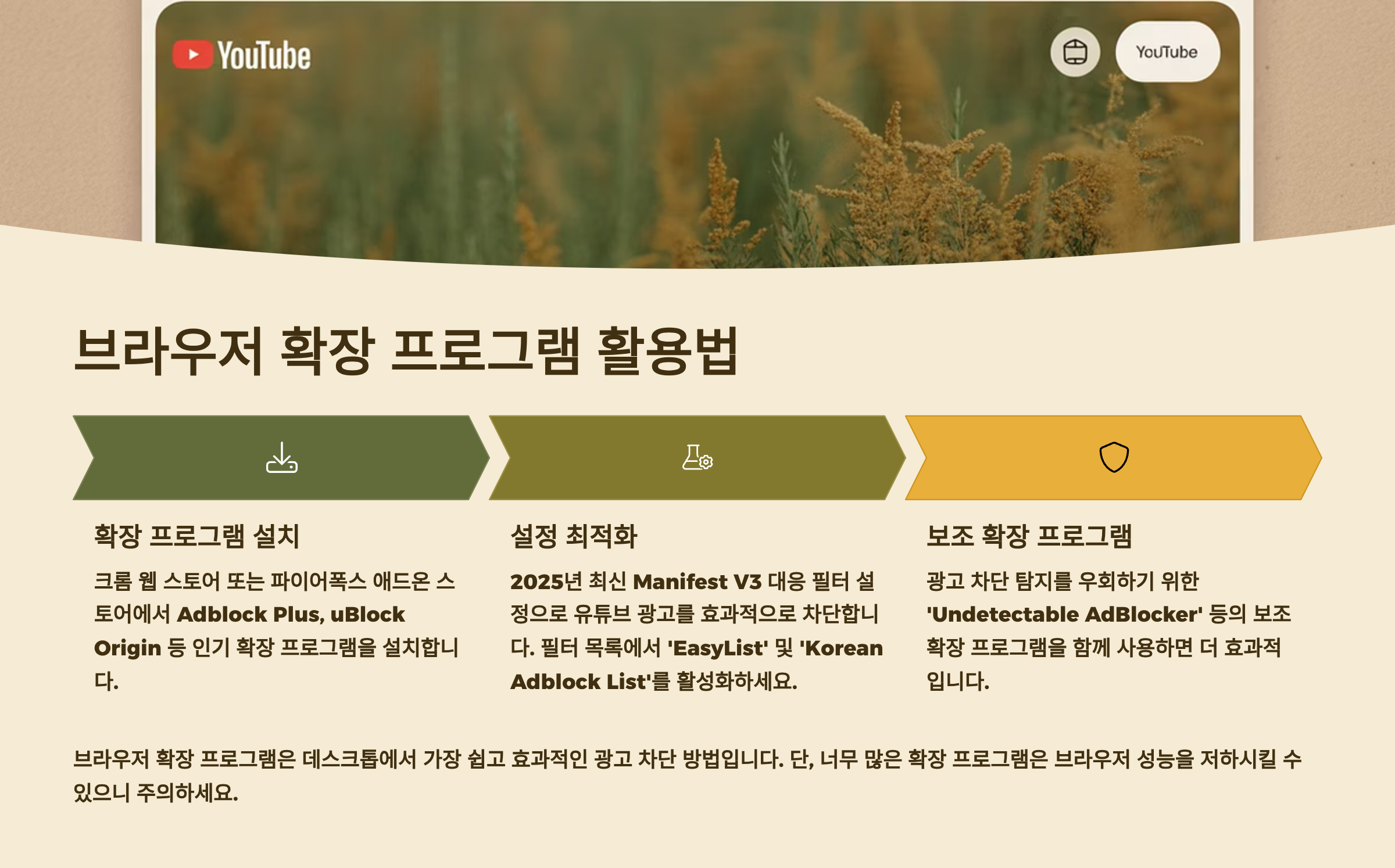 이 글에서 제공하는 정보는 교육 및 정보 제공 목적으로만 작성되었습니다. 광고 차단은 각 플랫폼의 이용약관에 위배될 수 있으며, 사용자의 책임 하에 이루어져야 합니다. 본 글의 내용을 따라 발생하는 어떠한 문제에 대해서도 작성자는 책임을 지지 않습니다. 또한 콘텐츠 크리에이터의 수익에 영향을 줄 수 있음을 인지하고, 좋아하는 크리에이터를 다른 방법으로 지원하는 것을 고려해 주시기 바랍니다.