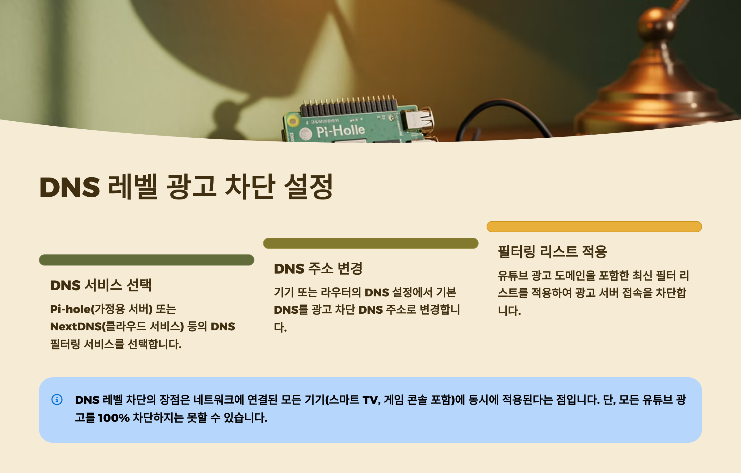 | Pi-hole | 자체 서버 | 완전 제어 가능 | 무료 |